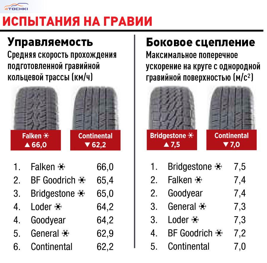 Более четкие различия между моделями выявляют испытания на гравии. Здесь «цепкая» Falken с лучшими показателями тяги и бокового сцепления заметно выделяется на фоне конкуренток. BFGoodrich (почти спортивная в управлении) и Bridgestone находятся рядом, тогда как General, Goodyear и Loder отстают.