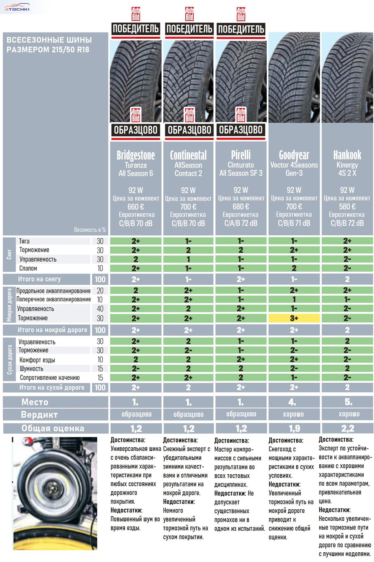 Всесезонным шинам в этой размерности не удалось полностью достичь высокого уровня специализированной летней или зимней шины. Однако среди трех «образцовых» продуктов можно сделать оптимальный выбор согласно предпочтениям: Bridgestone и Pirelli предлагают лучший компромисс при любой погоде, Continental ближе всего подходит к качественной зимней шине, но на сухом покрытии уступает. Goodyear также превосходна на снегу, однако теряет свой статус «образцовой» из-за увеличенного тормозного пути на мокрой дороге. Бюджетные шины Linglong и Giti не слишком убедительны по всем параметрам, а от дешевой шины марки Fortuna лучше держаться подальше.