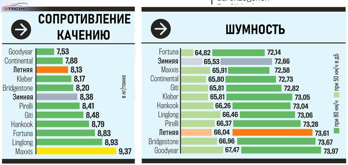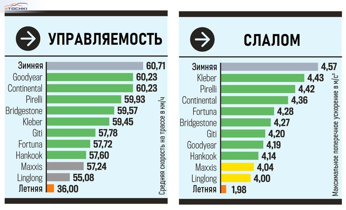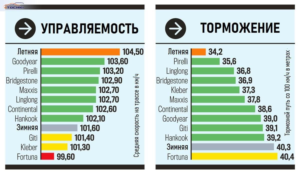 Самый короткий тормозной путь, с увеличением на 1,4 метра по сравнению с летней шиной, демонстрирует Pirelli. В управляемости она также лидирует практически наравне со спортивной шиной Goodyear. Бюджетному бренду Fortuna в этой дисциплине, напротив, нечего предложить, кроме тихого шума качения.