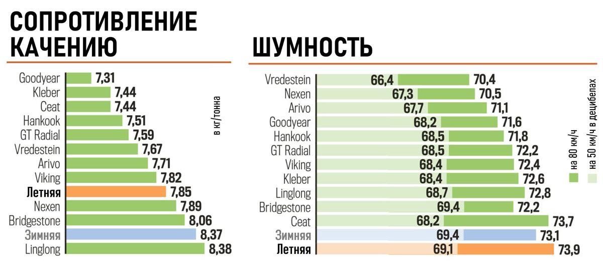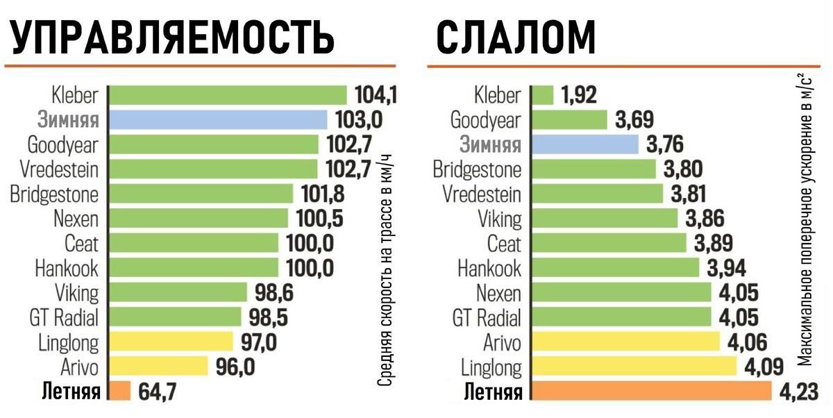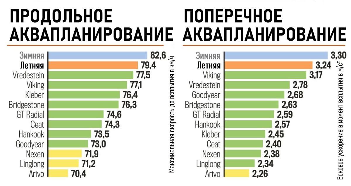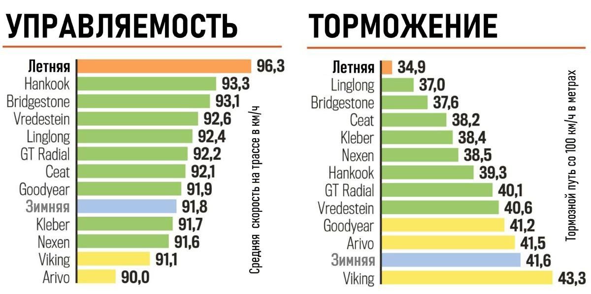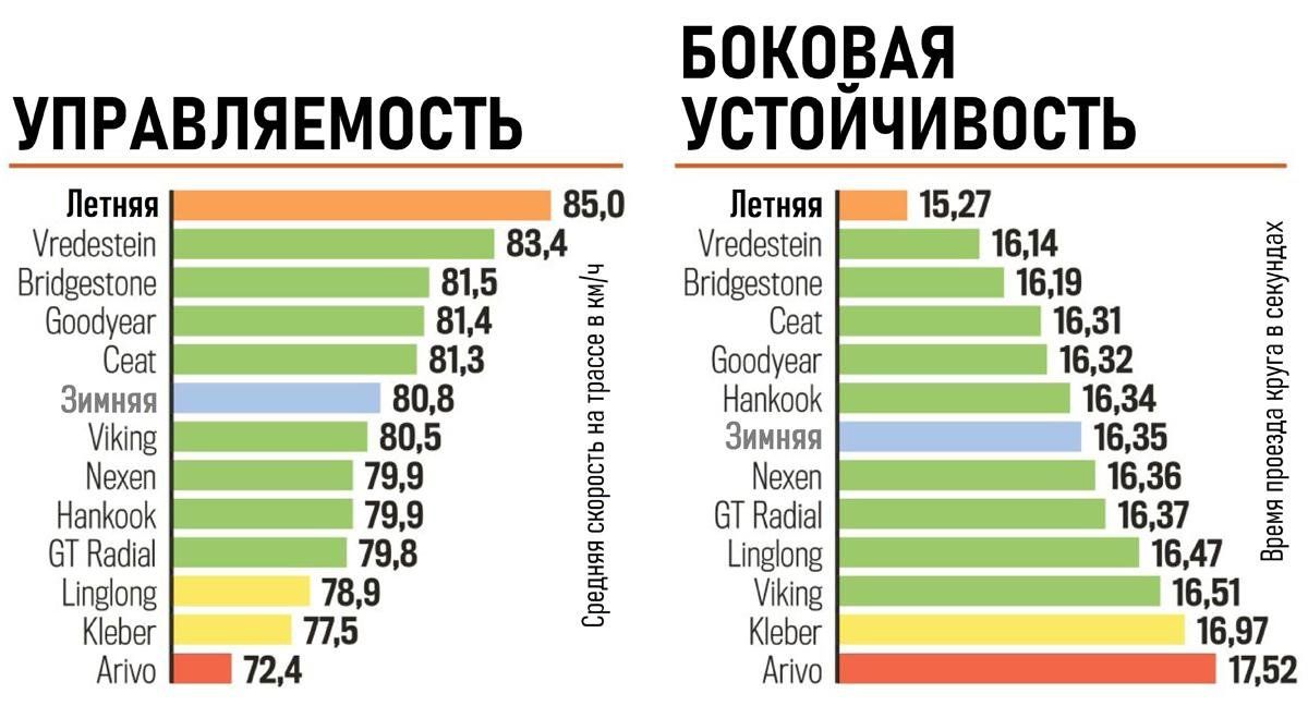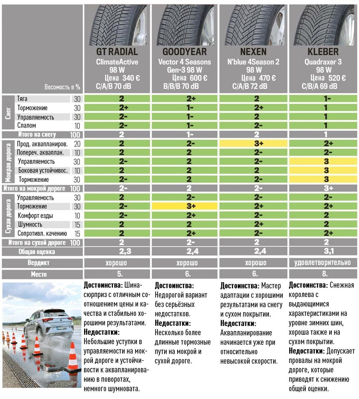 Хорошей летней шине нет равных в тормозном пути и боковой устойчивости на мокрой дороге. Всесезонная шина Vredestein наиболее близка к ней и также не показывает слабых мест в испытаниях на устойчивость к аквапланированию. Выдающиеся характеристики Kleber на снегу, очевидно, достигаются в ущерб сцеплению на мокрой поверхности. Bridgestone и Goodyear, кажется, нашли лучший компромисс и показывают хорошие результаты во всех тестовых дисциплинах на мокром покрытии. Arivo наглядно демонстрирует, что экономить на шинах - это совсем не круто: при торможении со 100 км/ч она отстает от Vredestein на целых 20 (!) метров. Это больше четырёх длин автомобиля - опасно!