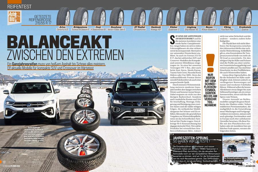 Они - восходящие звезды на рынке шин и удачное решение для большинства автолюбителей. Они уже давно стали безопасной и экономящей расходы альтернативой сезонной смене шин во многих классах автомобилей. Это касается и размера 215/55R17, который указан в рекомендациях для многочисленных моделей SUV компакт- и среднего класса. Например, для кроссовера Volkswagen T-Roc, который в этом тесте использовался в качестве тестового автомобиля, а также для Seat Ateca, Skoda Karoq, Toyota Yaris Cross, Hyundai Kona Electric или Fiat 500X. Ведь такой размер, заполняющий колесную арку, обеспечивает как комфорт езды, так и привлекательный внешний вид.