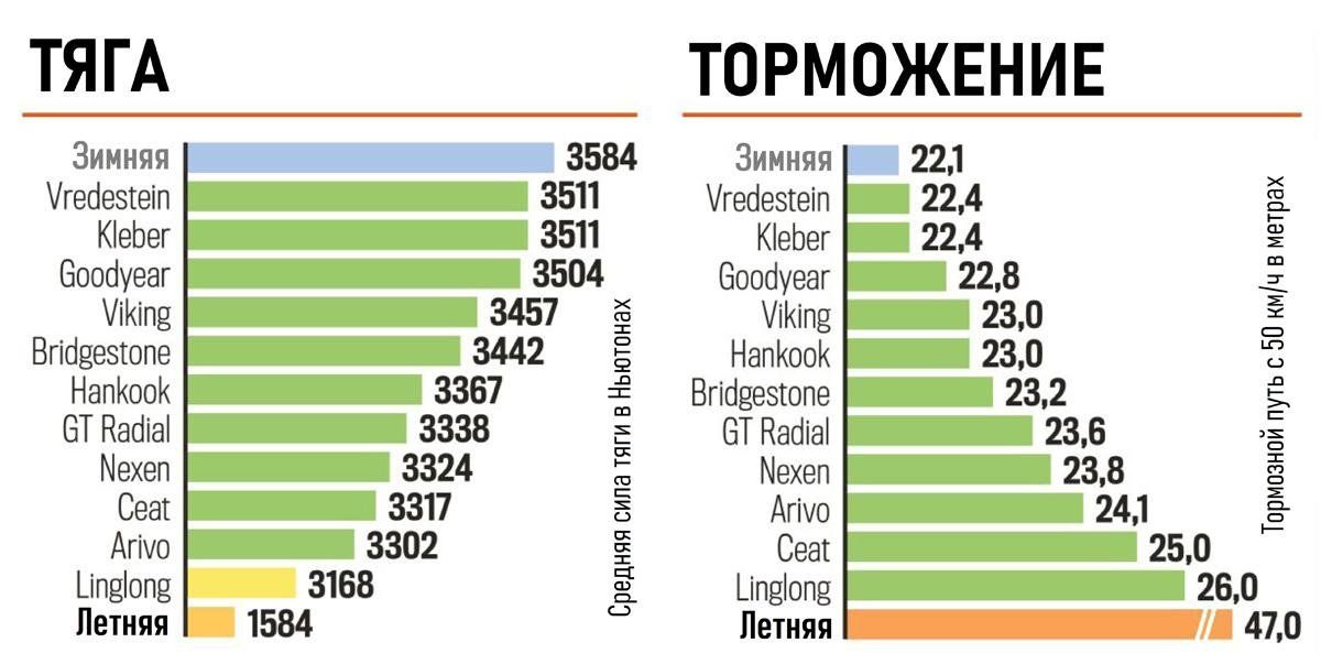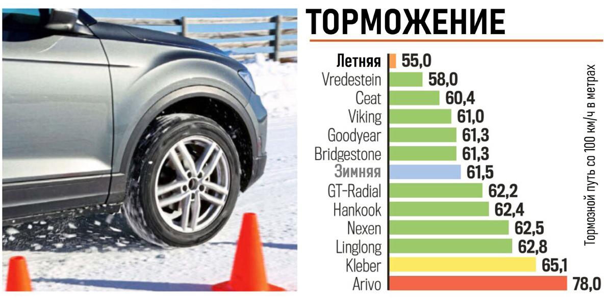 Для полноприводных автомобилей высокий уровень тяги не так важен, как для автомобилей с одной ведущей осью. В тесте на торможение на снегу всесезонные шины почти догоняют зимние: лучшие тормозные характеристики у Vredestein, Kleber и Goodyear.