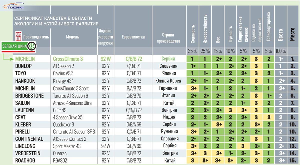 В этом году экспертов немецкого автоиздания убедила новая концепция Michelin CrossClimate 3: эта модель не только набирает баллы по экологическим характеристикам, но и получает общую оценку «хорошо». Таким образом, она превосходит Dunlop All Season 2, которая хотя и лидирует по экологическому балансу, но в общем зачете получает лишь «удовлетворительно».