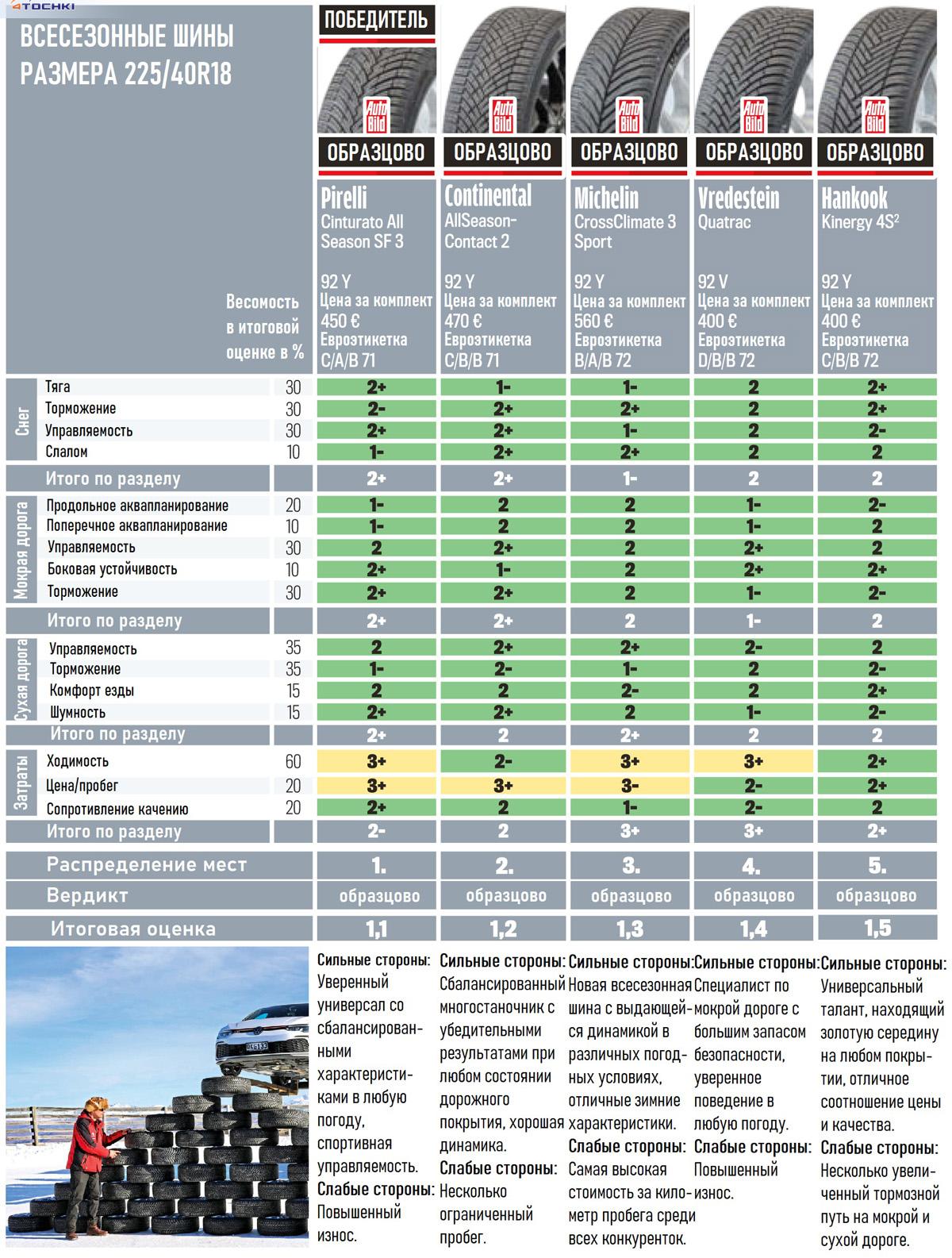 Достоверно известно, что современные всесезонные шины вплотную приближаются к узкоспециализированным летним и зимним моделям. Высокий спрос технологически ускоряет это развитие. Преимущества всесезонок очевидны: автовладельцы могут избежать утомительной сезонной смены комплекта шин и, в зависимости от наличия места для хранения, даже сэкономить на расходах по складированию. Но удается ли всесезонным шинам сохранять баланс производительности и удобств в размере 225/40R18, на который ориентированы такие спортивные компактные автомобили, как VW Golf GTI, BMW M135 или Audi S3? Чтобы ответить на этот вопрос, редакция немецкого автожурнала Auto Bild протестировала 30 актуальных моделей всесезонных шин.