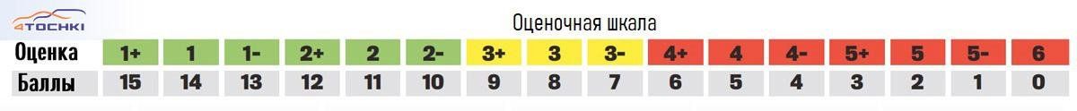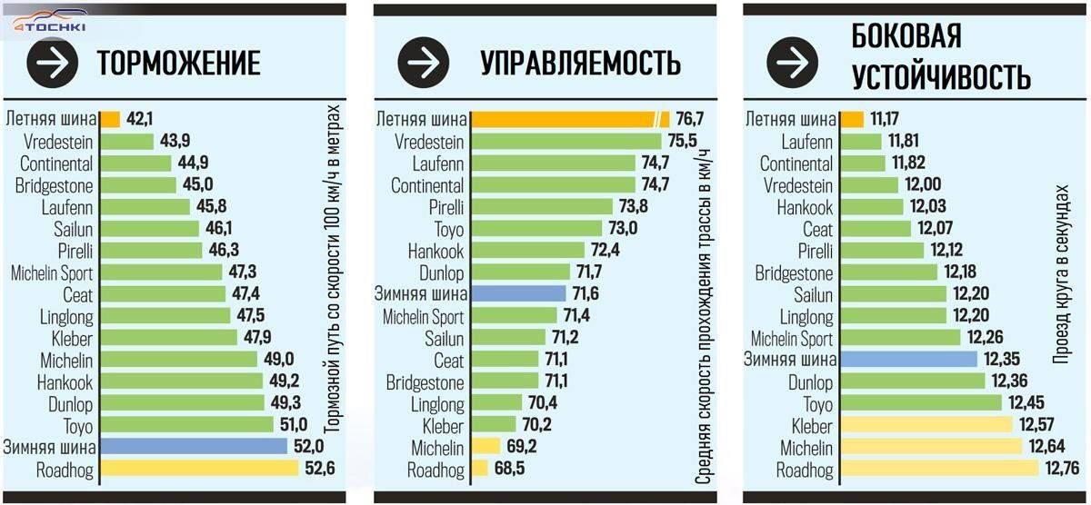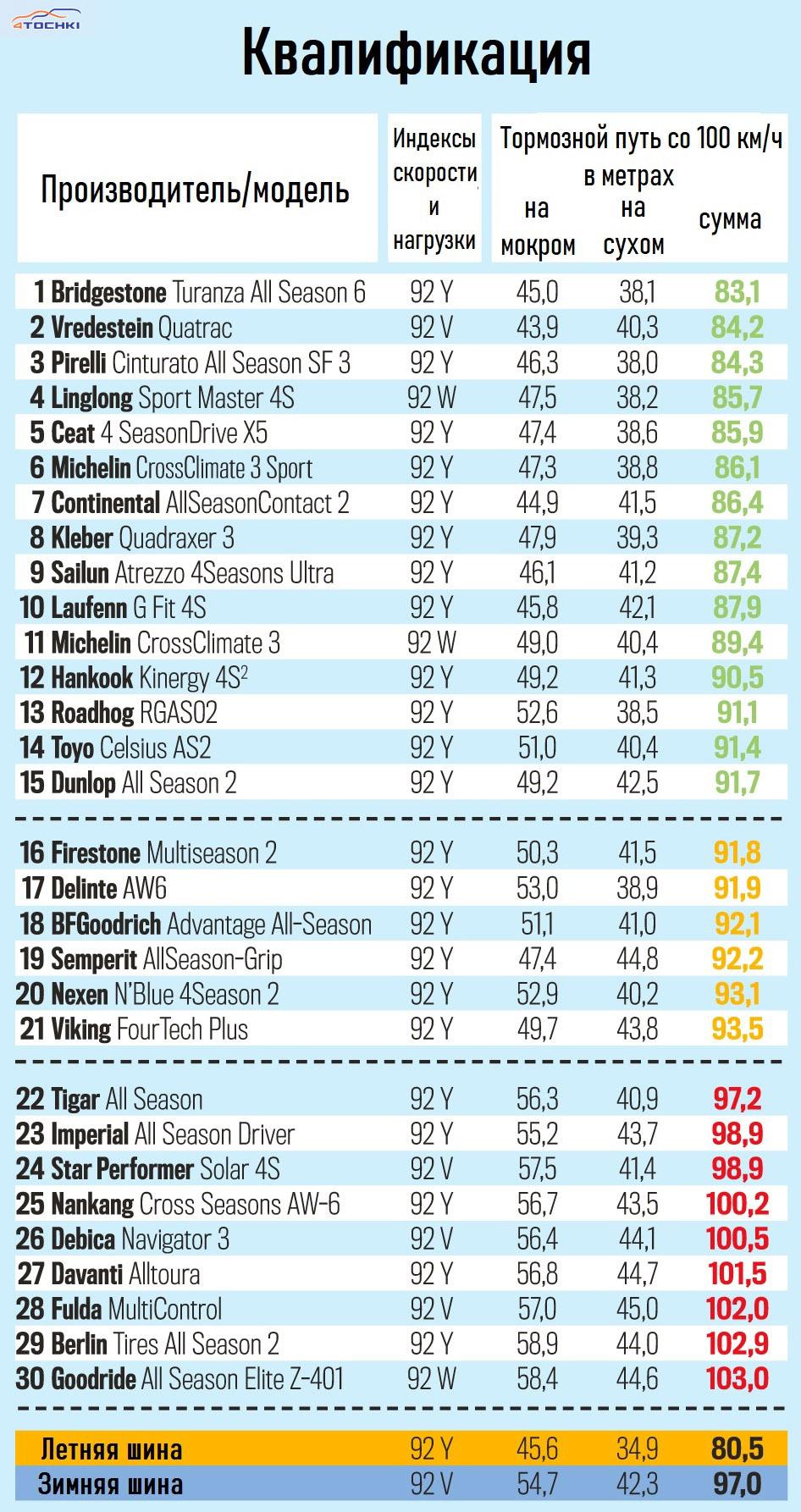 В квалификационном испытании проводились многократные торможения каждой шиной на специальной измерительной дорожке мокрой и сухой трассы со скорости 100 км/ч до полной остановки. Учитывался усредненный результат из десяти торможений. Только шины с наилучшими суммарными показателями тормозного пути на мокрой и сухой дороге (отмечены зелеными цифрами) проходят в основной этап, в финал. Шины на желтом фоне уже демонстрируют увеличенные тормозные пути и поэтому опускаются во «вторую лигу». От низкопроизводительных шин, отмеченных красным, лучше вообще держаться подальше - ради вашей собственной безопасности.
