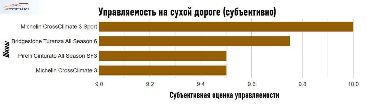 СУБЪЕКТИВНАЯ ОЦЕНКА УПРАВЛЯЕМОСТИ. Как и на мокром покрытии Michelin CrossClimate 3 Sport заработала от Джонатана Бенсона 10 баллов. Bridgestone и CrossClimate 3 получили по 9,5 балла.