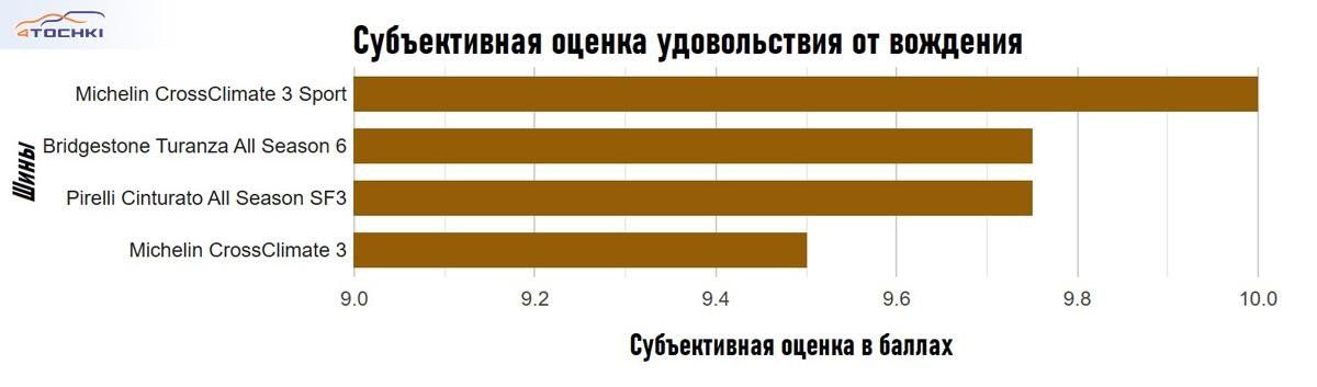 УДОВОЛЬСТВИЕ ОТ ВОЖДЕНИЯ. И здесь CrossClimate 3 Sport была лучше соперниц - 10 баллов.