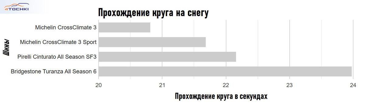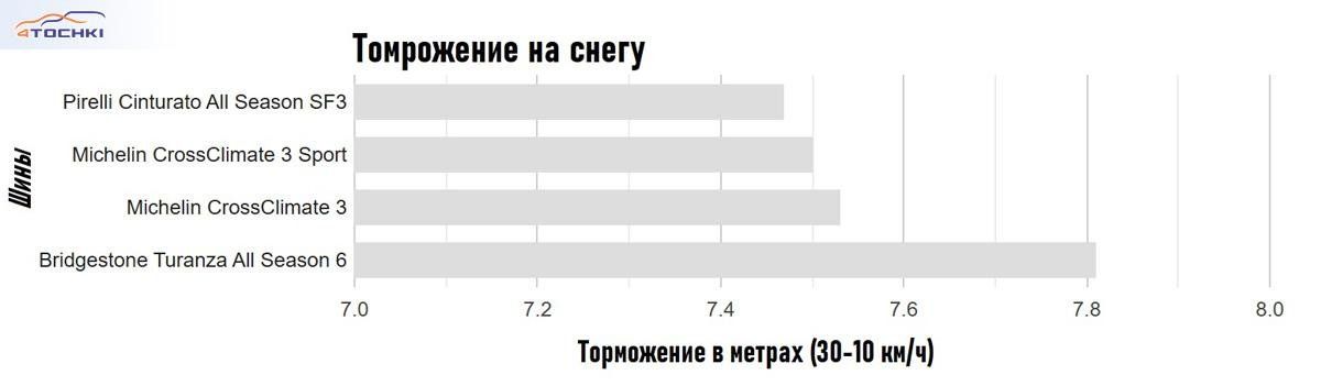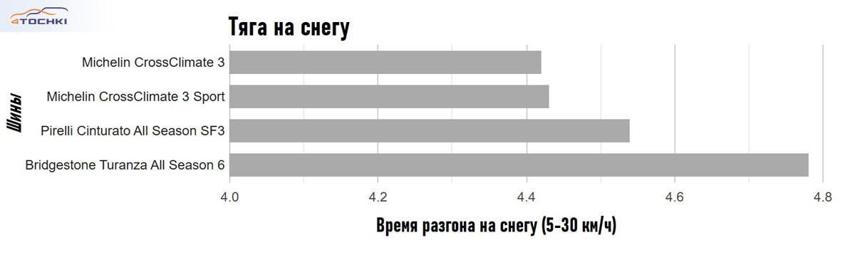 ТЯГА НА СНЕГУ. Измерялось время разгона с 5 до 30 км/ч. Быстрее других с этой задачей справилась CrossClimate 3 (4,42 секунды), совсем немного (всего 0,01 секунды) уступила ей спортивная версия новой всесезонки Michelin. Хуже всех опять была Bridgestone, её отставание от лидера составила составило 7,5 процента (4,78 секунды).