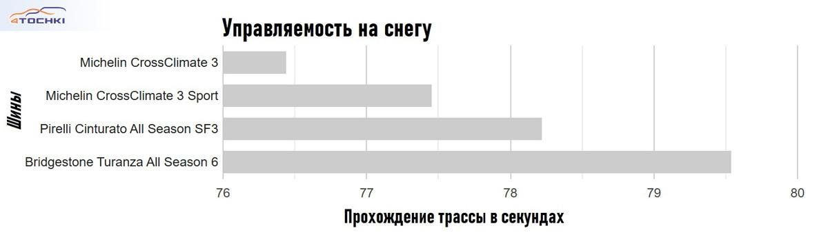 УПРАВЛЯЕМОСТЬ. Быстрее всех заснеженную трассу на легком морозце (-6,5°C) преодолела Michelin CrossClimate 3 - 76,44 секунды. CrossClimate 3 Sport оказалась неожиданно близка к CC3, несмотря на спортивный уклон. Bridgestone отстала от лидера более, чем на 3 секунды, но для регионов с редкими снегопадами она вполне подойдет.