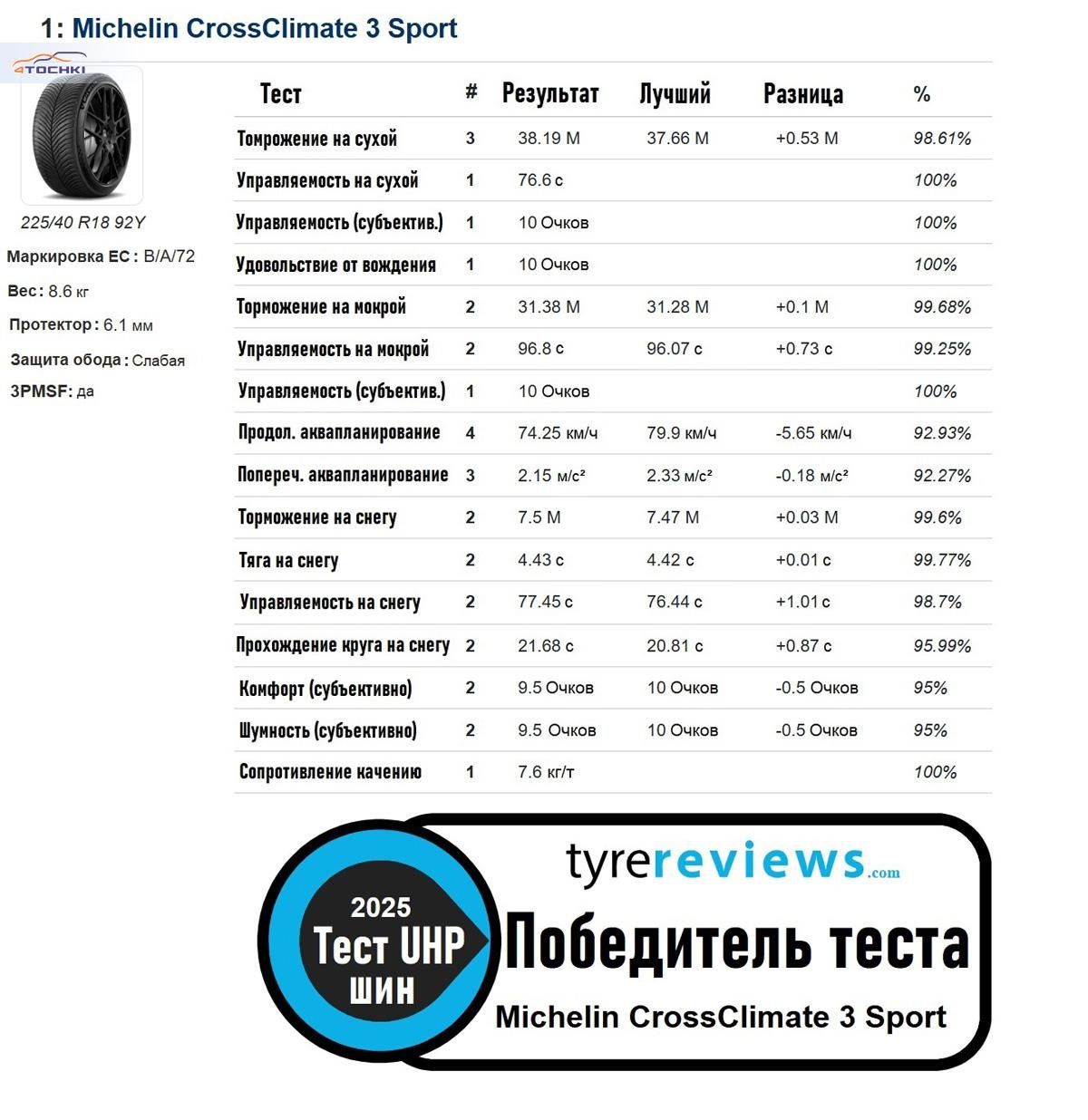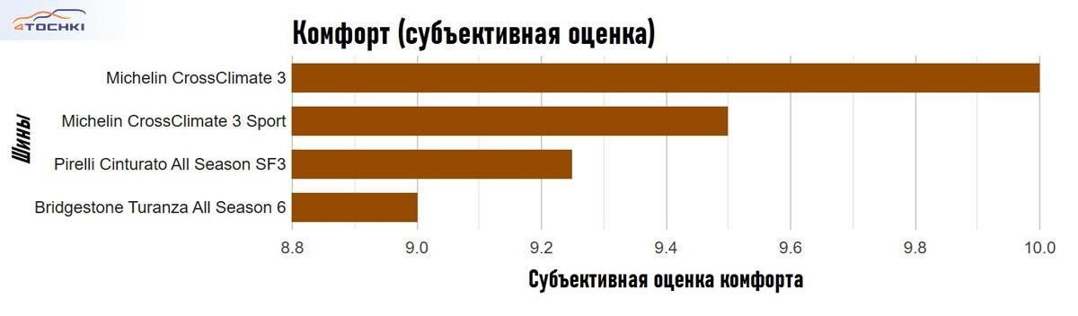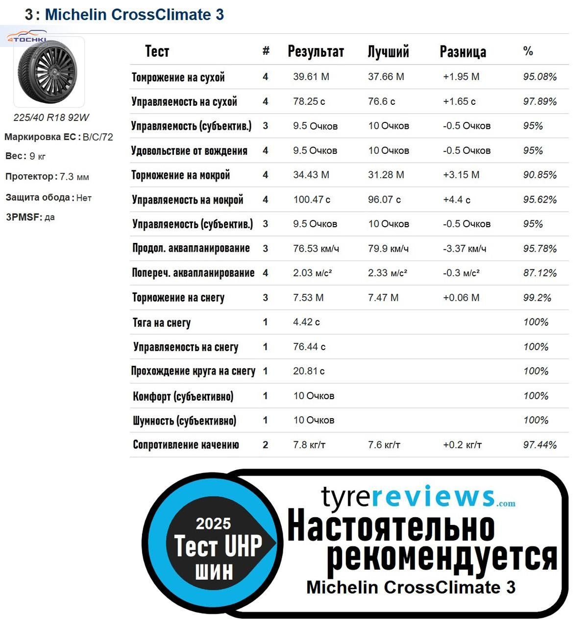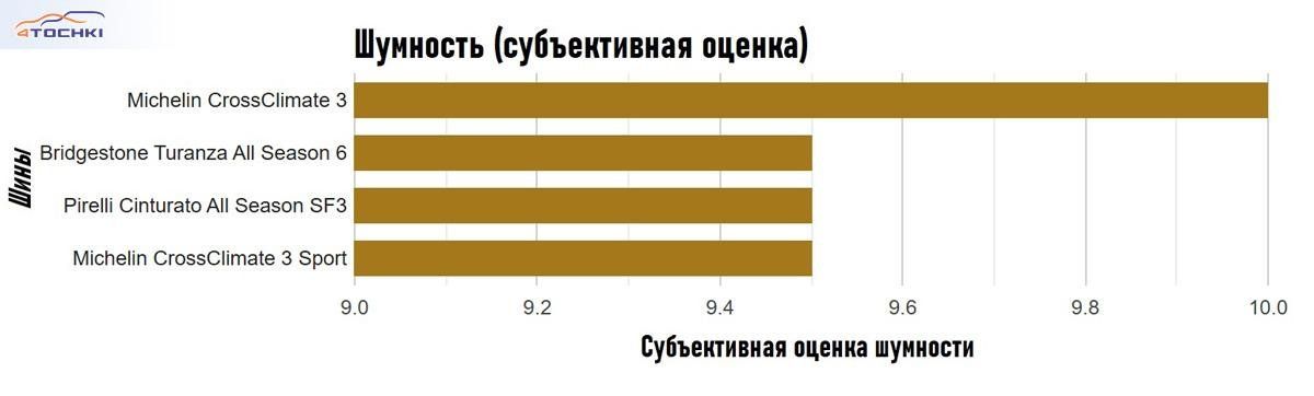 ШУМНОСТЬ. Michelin CrossClimate 3 получает от Tyre Reviews 10 баллов, остальные по 9,5 балла.