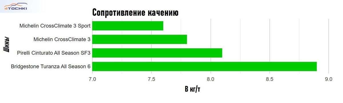 СОПРОТИВЛЕНИЕ КАЧЕНИЮ. Michelin CrossClimate 3 Sport с показателем 7,6 кг/т, на 7 процентов экономичнее Pirelli и на 17 процентов - Bridgestone.