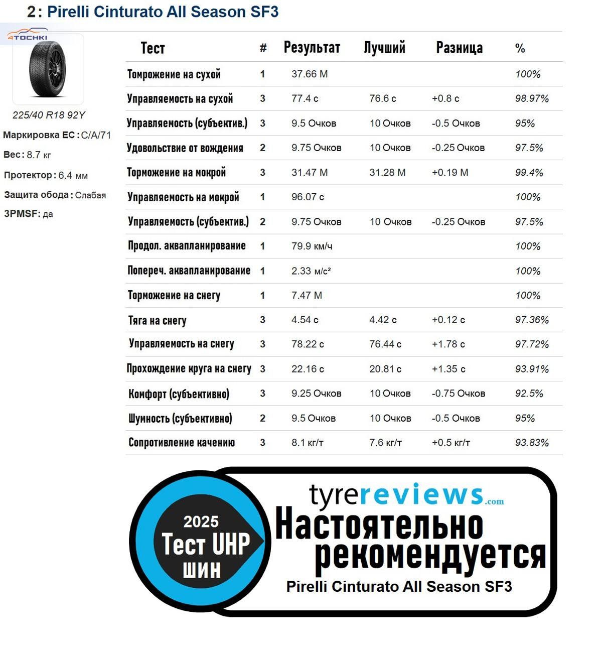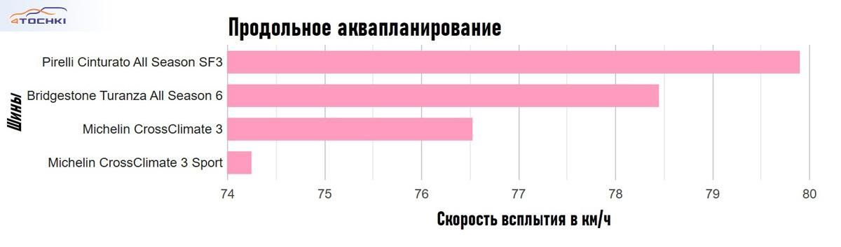 ПРОДОЛЬНОЕ АКВАПЛАНИРОВАНИЕ. Pirelli Cinturato All Season SF3 обладает самым большим запасом устойчивости к аквапланированию на прямой, сохраняя контакт с залитой водой поверхностью дороги до скорости 79,9 км/ч. Худшая в этой дисциплине Michelin CrossClimate 3 Sport всплывает при скорости 74,25 км/ч.