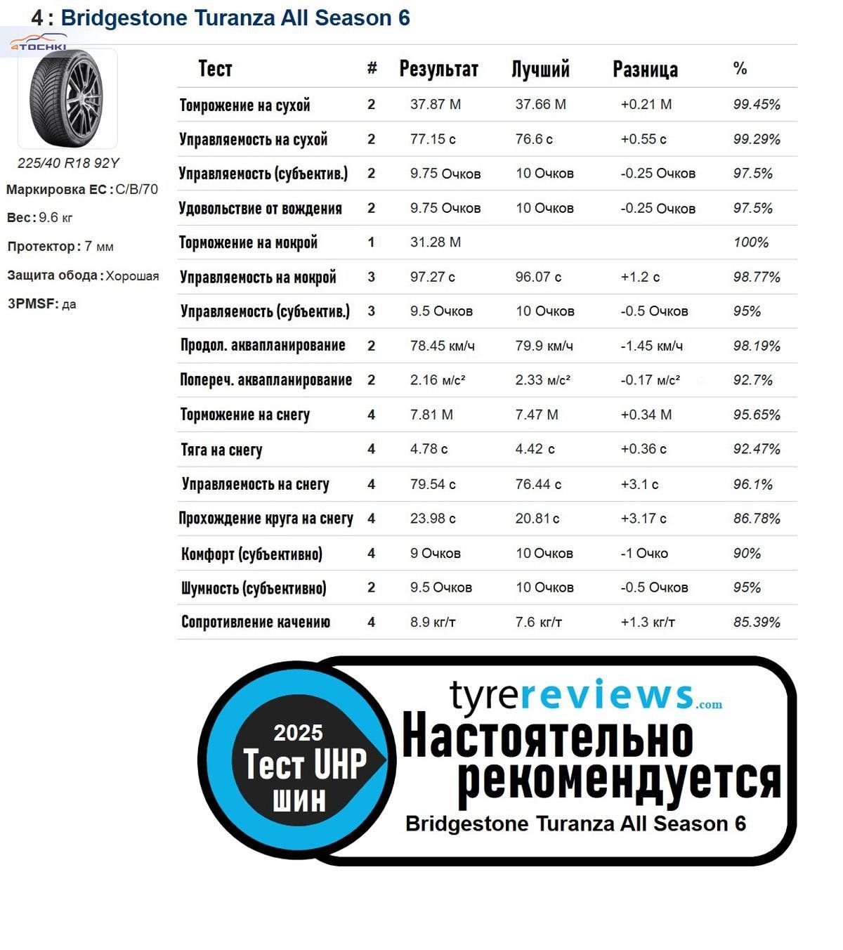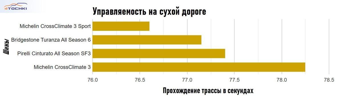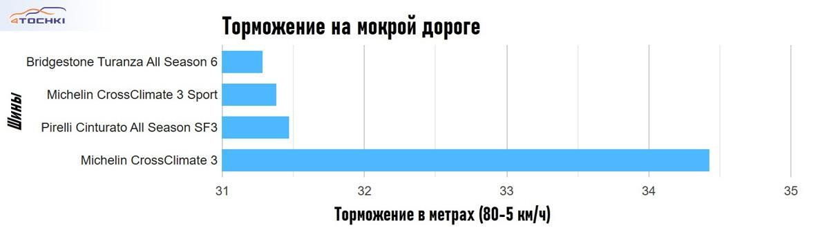 ТОРМОЖЕНИЕ. Измерялся тормозной путь со скорости 80 км/ч до 5 км/ч. Средняя температура воздуха во время тестирования составляла 9°C. Лучший результат показала Bridgestone Turanza All Season 6. Результаты трех лучших шин (Bridgestone, Pirelli, CC3 Sport) отличались всего на 0,6 процента. CC3 отстала от лидера на почти 10 процентов.