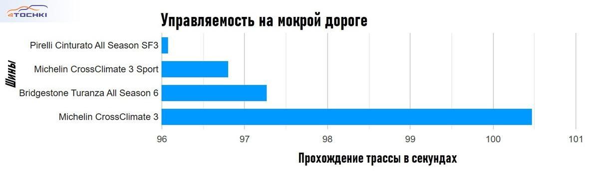 УПРАВЛЯЕМОСТЬ НА МОКРОЙ ДОРОГЕ. Измерялось время прохождения мокрой гоночной трассы. Pirelli Cinturato, как всегда, показала себя лидером по сцеплению на мокром покрытии. CrossClimate 3 Sport оказалась неожиданно хороша! Она обеспечивает не только хорошее сцепление, но и спортивную отзывчивость. Отлично показывает себя в этом размере и Bridgestone Turanza - предсказуемая, безопасная. CrossClimate 3 улучшила показатели по сравнению с CC2, но в этом размере отстаёт от конкуренток по времени прохождения круга примерно на 3 процента, демонстрируя хорошую управляемость, но чуть меньше сцепления.