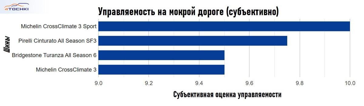 СУБЪЕКТИВНАЯ ОЦЕНКА УПРАВЛЯЕМОСТИ. Поведение шин на мокром покрытии оценивалось по десятибалльной шкале. Michelin CrossClimate 3 Sport получила максимальную оценку в 10 баллов. Bridgestone и CrossClimate 3 уступили лидеру по 0,5 балла.
