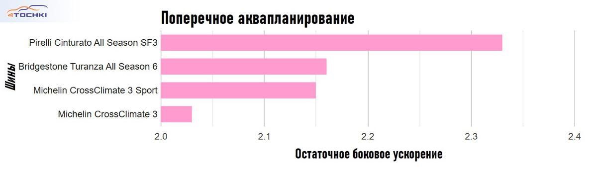 ПОПЕРЕЧНОЕ АКВАПЛАНИРОВАНИЕ. Pirelli не менее убедительна и в устойчивости к аквапланированию в повороте, удерживаясь на трассе при боковом ускорении 2,33 м/с². CrossClimate 3 занимает последнее место с показателем - 2,03 м/с².