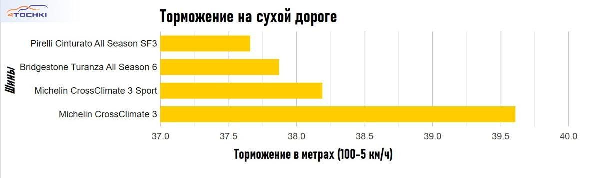 ТОРМОЖЕНИЕ. Измерялся тормозной путь со скорости 100 км/ч до 5 км/ч. Средняя температура во время тестирования составляла 11,5°C. Лучший результат показала Pirelli Cinturato All Season SF3 - 37,66 метра. CrossClimate 3 отстала от лидера почти на 2 метра.