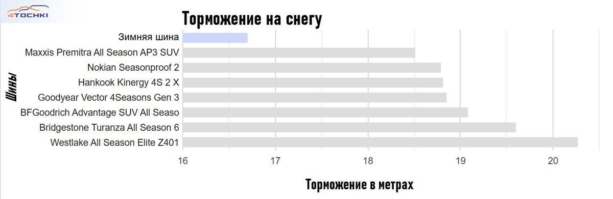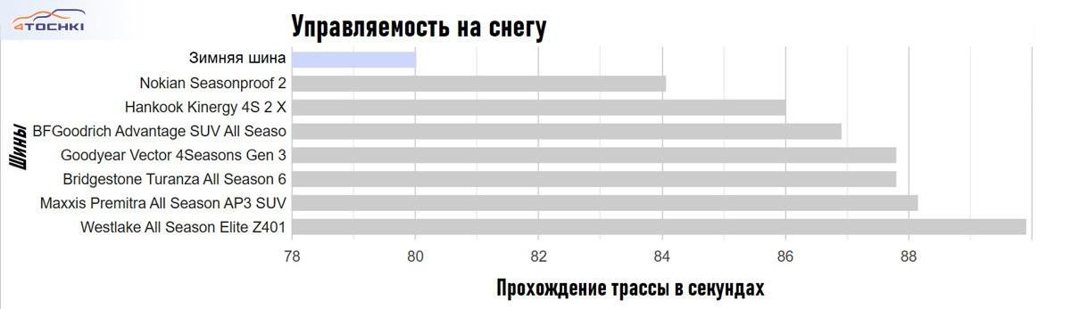 Для многих крайне важно, как ведет себя всесезонная шина на снегу, поэтому было протестировано сцепление, торможение и управляемость - и обнаружено несколько любопытных особенностей.