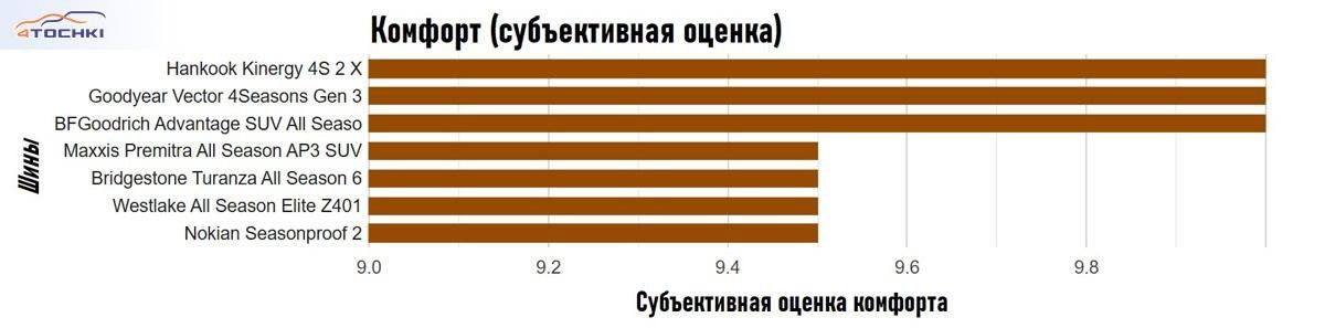 Комфорт езды также оказался на очень близком уровне. Goodyear, Hankook и BFGoodrich опередили остальных буквально на шажок, но разница была столь незначительной, что любую из этих шин можно выбрать без опасений - даже бюджетный вариант не разочарует.