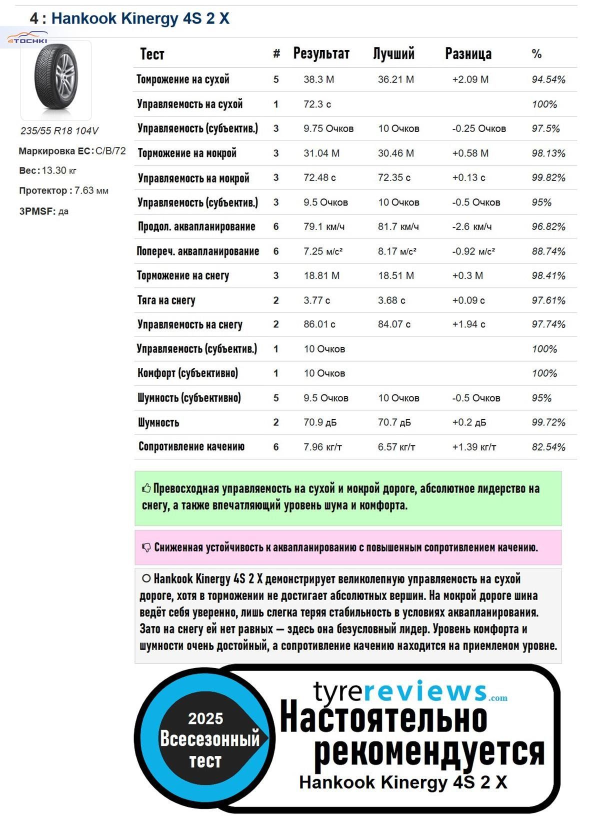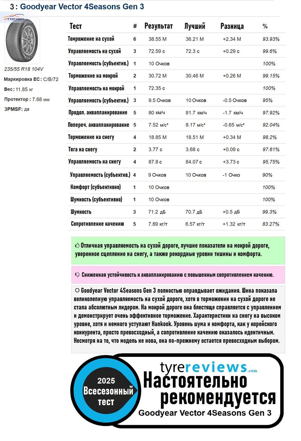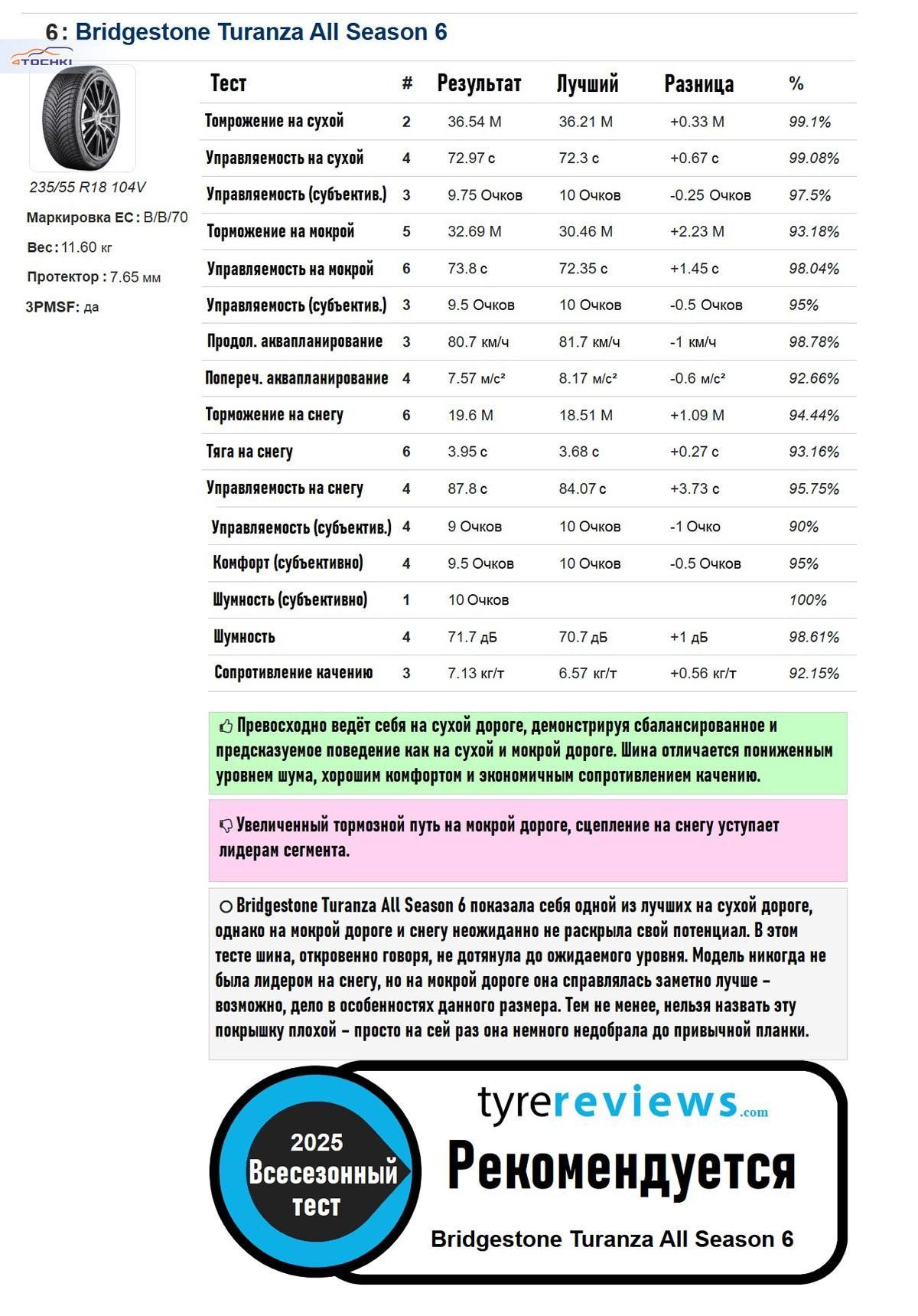 Обратите внимание: при публикации данных сопротивление качению Bridgestone было случайно установлено на уровне 9 кг/т. Ниже приведено правильное значение. Это не меняет общего результата, но подчёркивает низкое сопротивление качению японской шины.