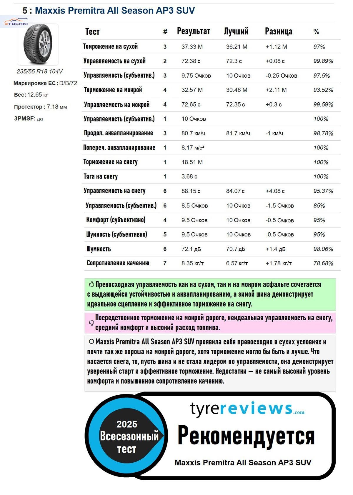 И вот Maxxis буквально уничтожила конкурентов в тестах на тягу и торможение. Она была настолько впереди, что были перепроверены все данные - но результат подтвердился. Отличная работа, Maxxis! Остальные шины выстроились вполне предсказуемо, за исключением Nokian, которая неожиданно отстала в тесте на тягу. Непонятно почему - возможно, эта шина лучше работает с небольшой пробуксовкой, но тогда непонятно, почему в торможении она показала себя прекрасно. Впрочем, если учесть, что это всесезонные шины, все они (кроме Westlake) великолепно справились со снегом.