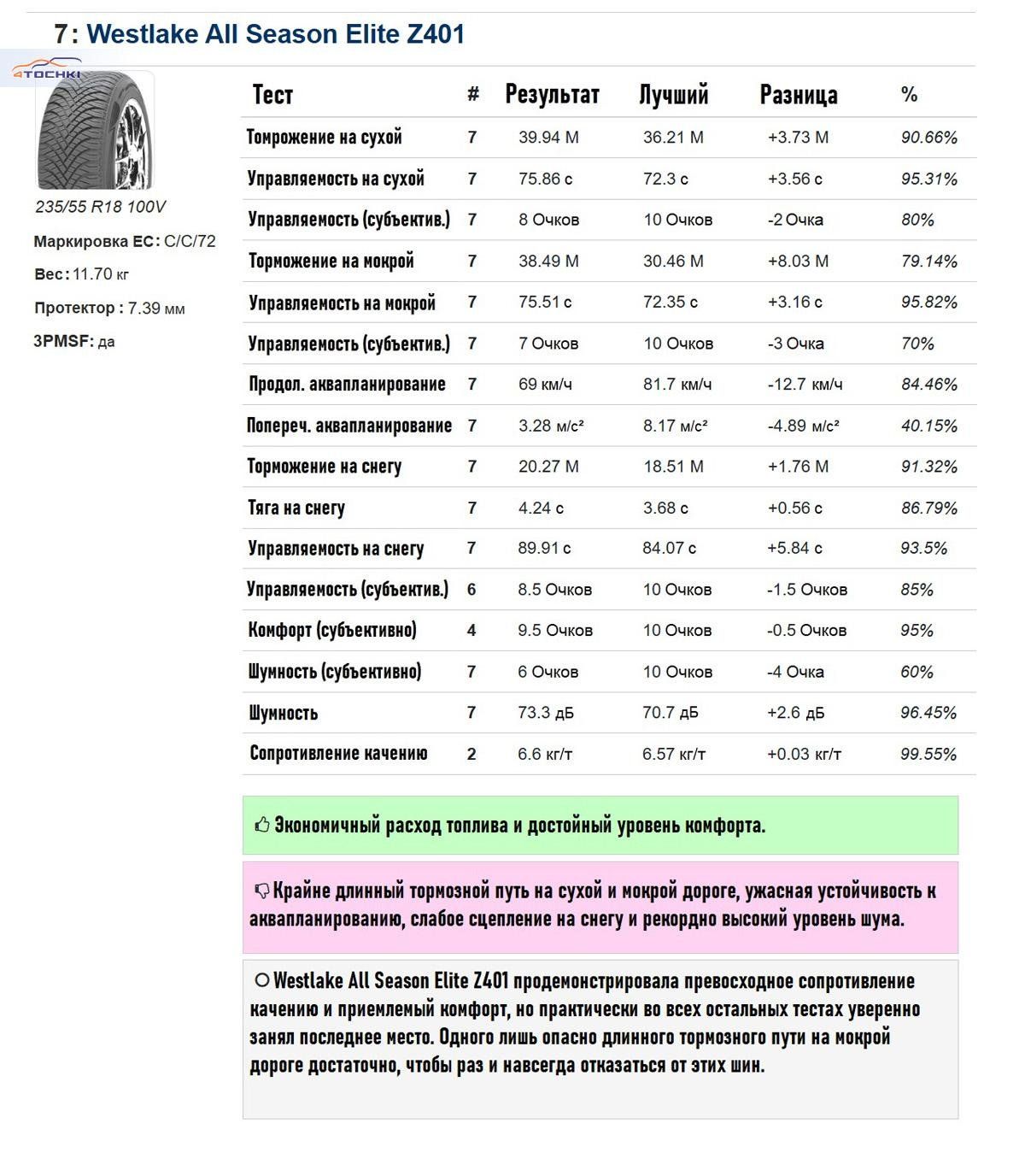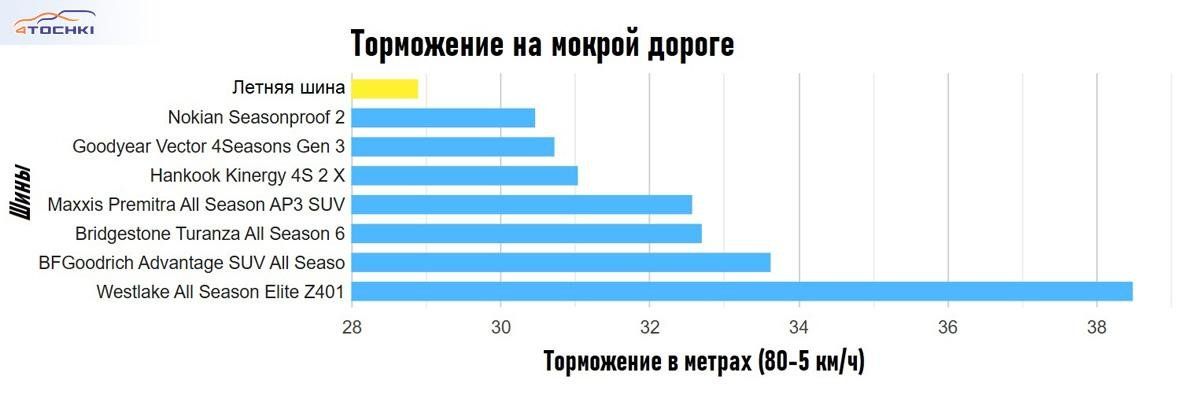 Зато торможение на мокрой дороге расставило всё по местам. Бюджетная шина отстала от лидера (новой Nokian) на целых 27 процентов! При этом распределение мест почти совпало с результатами теста на управляемость: снова лучшими стали Goodyear и Nokian, но на этот раз Nokian вырвалась вперёд.