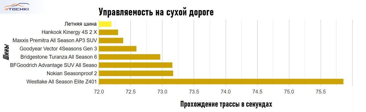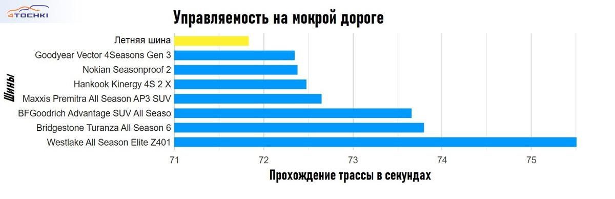 Шесть шин показали результаты в пределах 1 процента друг от друга на 75-секундном круге с 13 поворотами. Если вам нужна всесезонная шина для сухого трек-дня, подойдёт любая модель, кроме бюджетной.