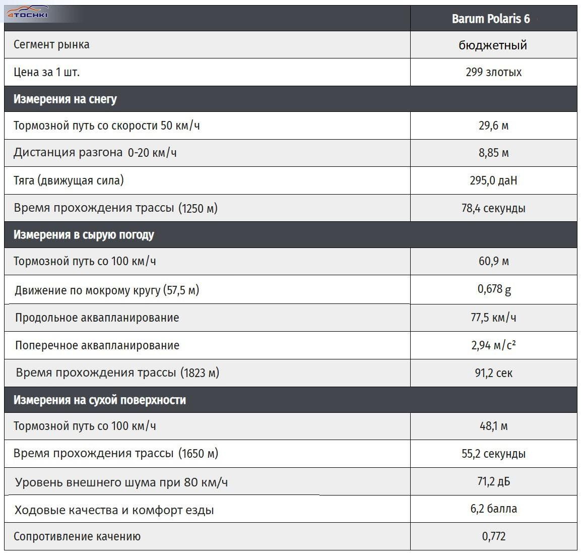 Новая модель Barum только вышла на рынок и сразу же демонстрирует отличные результаты в сравнительных тестах. Бюджетная шина отлично себя показывает на снегу и получает хорошие оценки в тестовых дисциплинах на сухом асфальте. Больше всего баллов Polaris 6 потеряла на мокром покрытии, где показывает средние результаты, но сохраняя при этом необходимый уровень безопасности. И, наконец, Barum побеждает в тесте на сопротивление качению с очень хорошим результатом.