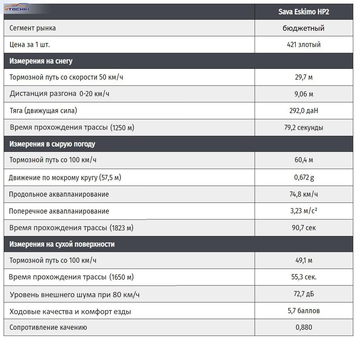 Sava - пример бюджетной шины, которая не превосходит конкуренток, но и не разочаровывает. Она демонстрирует средний уровень эксплуатационных характеристик на всех типах дорожного покрытия и обеспечивает необходимый уровень безопасности. При этом Eskimo HP2 генерирует самый высокий уровень внешнего шума в тестовой группе и имеет высокое сопротивление качению.