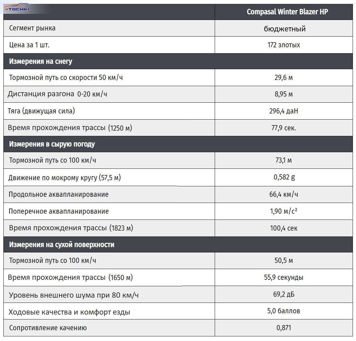 Результаты выступления Compasal в этом тесте демонстрируют, что пока не все китайские шины достаточно надёжны. Winter Blazer HP - пример неправильно сбалансированной шины, которая отлично работает на снегу, но не справляется в других условиях. Если на сухой дороге при общей нехватке производительности она обеспечивает необходимый минимальный уровень безопасности, то на мокром асфальте она просто опасна. Кроме того, у неё довольно высокое сопротивление качению.