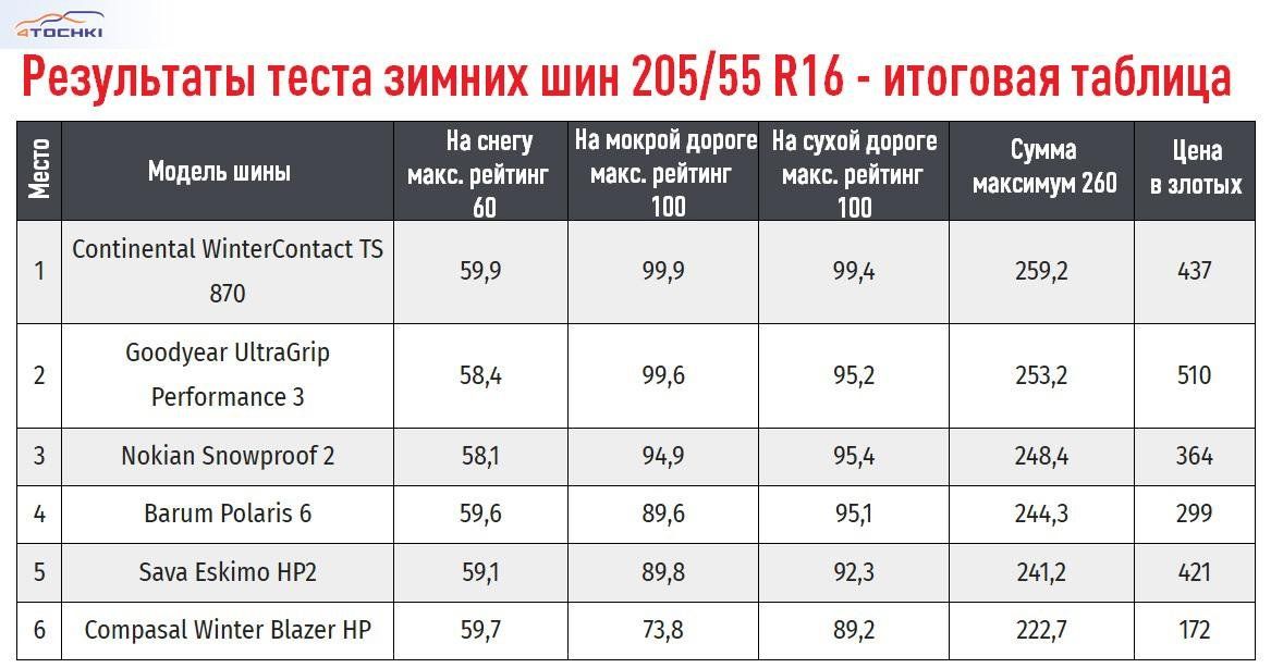 В этом году в тесте зимних шин победу одержала Continental WinterContact TS 870, которая одержала победу в большинстве тестовых дисциплин. Немецкая шина отлично себя показала на снегу, мокром и сухом асфальте, обеспечивая высочайший уровень безопасности. Второе место заняла Goodyear UltraGrip Performance 3, которая впечатляюще выступила на мокром и на сухом покрытии, но показала средние результаты на снегу, оставаясь при этом безопасной даже в этих условиях. Nokian Snowproof 2 заняла третье место. Финская шина немного отстаёт от своих конкурентов премиум-класса, но демонстрирует отличные результаты в любых дорожных условиях.