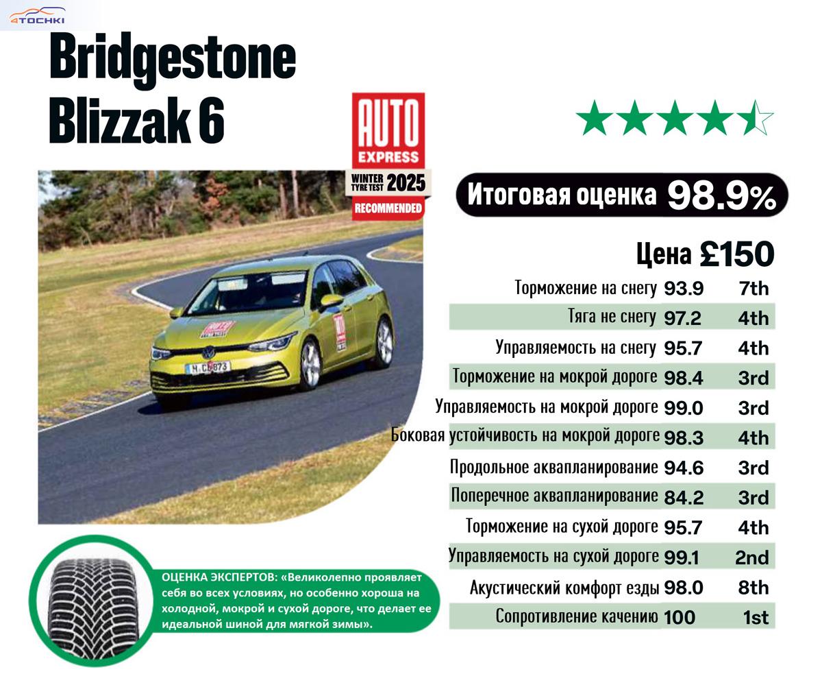 Blizzak 6 оказалась самой шумной на контрольных покрытиях, но не критично, и показала самое низкое сопротивление качению, став самой экономичной шиной в тесте.