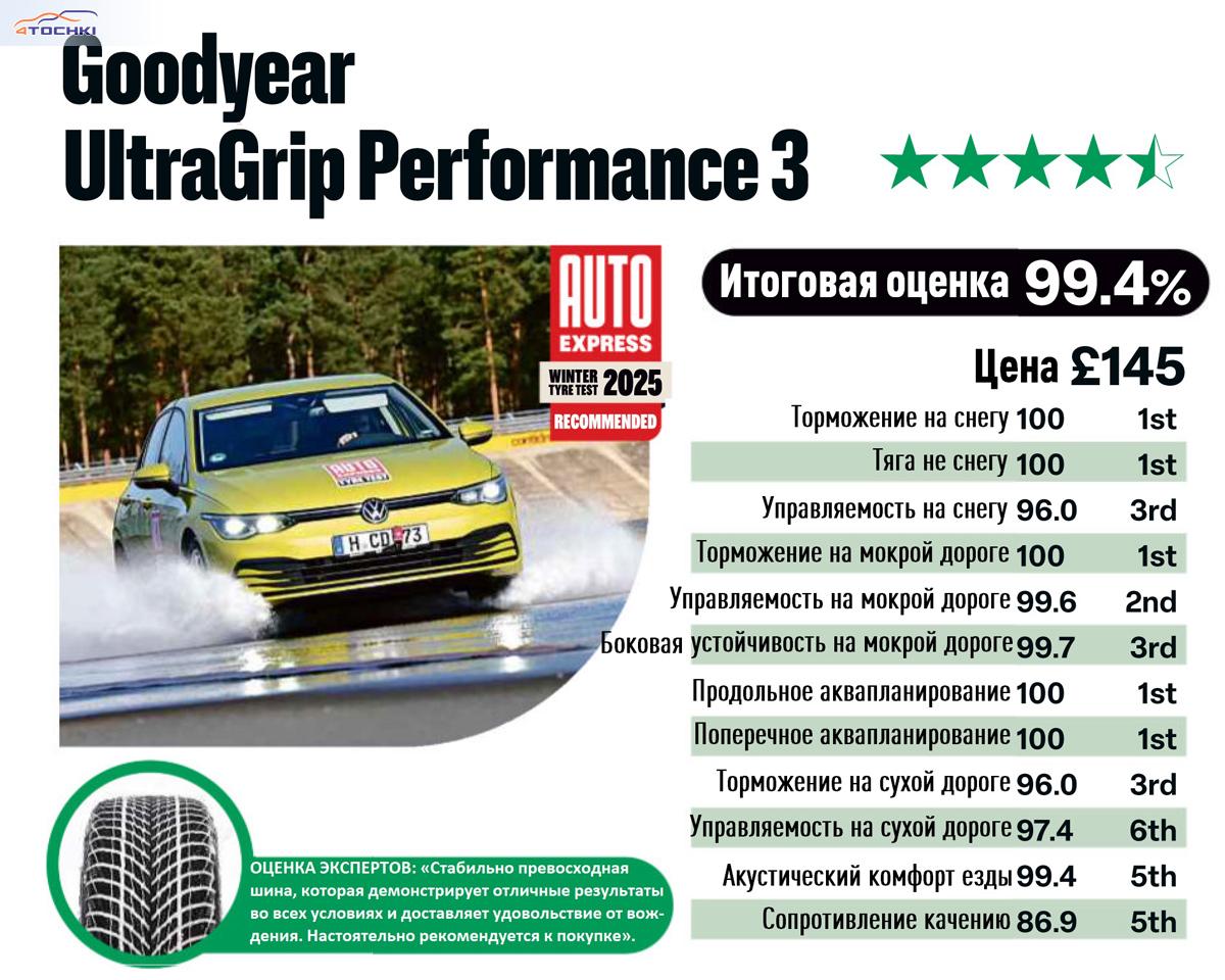 Также она показала выдающуюся производительность на мокрой дороге, задав стандарт как в продольном, так и в поперечном аквапланировании, а также в ключевом тесте на торможение, где остановилась почти на 0,5 метра раньше шины, занявшей второе место. Goodyear заняла третье место в устойчивости на мокрых поворотах, уступив лидеру лишь доли процента, и очень близкое второе на трассе управляемости, где ее отзывчивость и динамика вновь впечатлили тестировщиков. UltraGrip решительно заходила в повороты, была невероятно точной и быстро восстанавливала сцепление - великолепная работа.