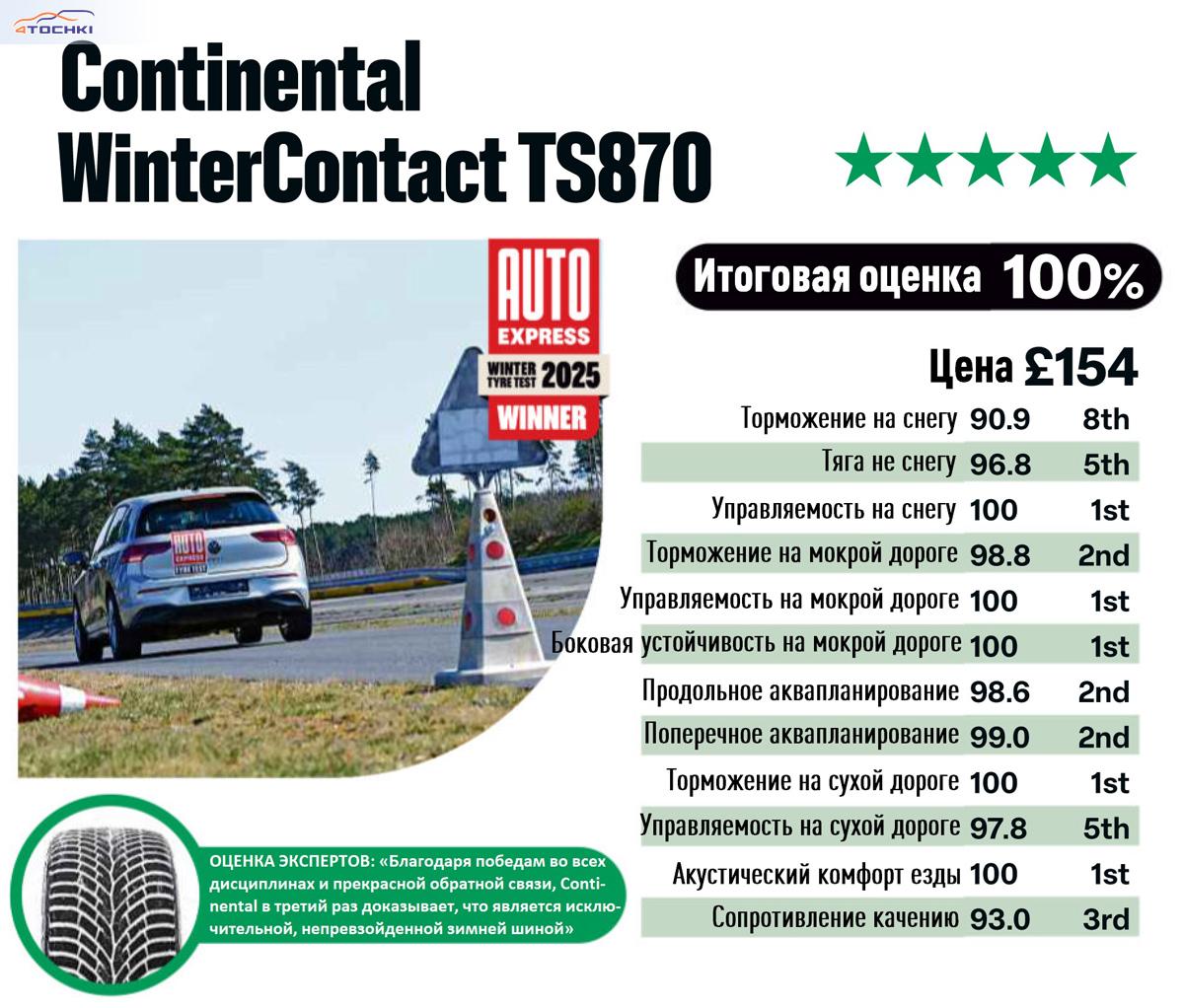 Continental WinterContact TS 870 - уникальная зимняя шина, которая в третий раз одержала победу в тесте журнала Auto Express. Она побеждает соперниц на снегу, мокрой и сухой дороге, и отличается великолепной управляемостью, акустическим комфортом и приемлемой экономичностью.