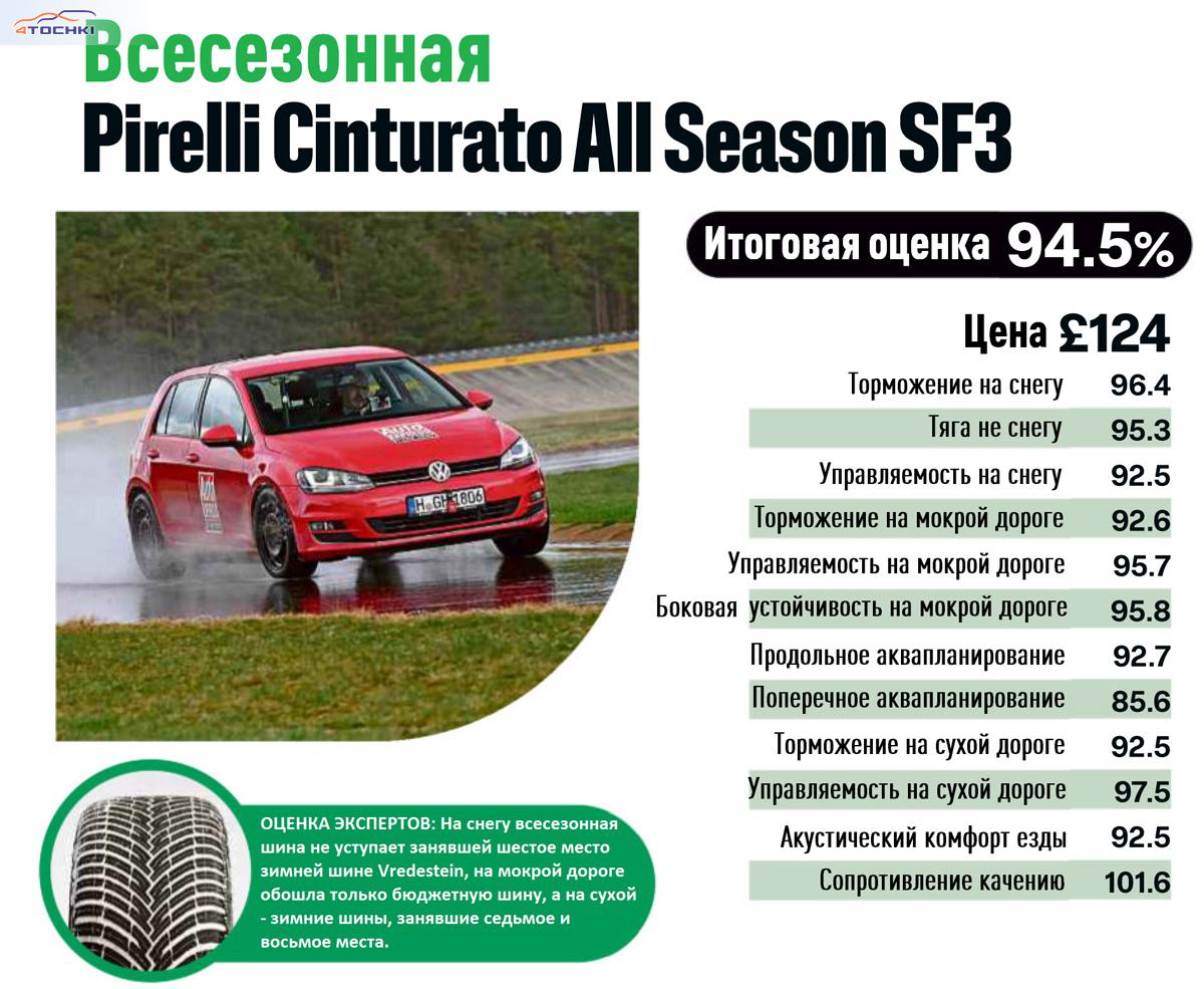 Всесезонная шина Pirelli Cinturato All Season SF3, победившая в тестах Auto Express 2024 года, продемонстрировала на снегу такие характеристики, которые поставили ее в один ряд с занявшей шестое место зимней шиной Vredestein Wintrac Pro+. В прошлом году, в более мягких условиях, близких к верхнему пределу для зимних шин (около 7°C), эта всесезонка превзошла зимние шины на мокрой дороге. Однако в этом году, при более низких температурах (4°C), она обошла на мокрой дороге только бюджетную шину, а на сухой - зимние шины, занявшие седьмое и восьмое места. При этом всесезонная шина показала более низкое сопротивление качению, чем все зимние шины, и, несомненно, превзошла бы их в летнюю жару.