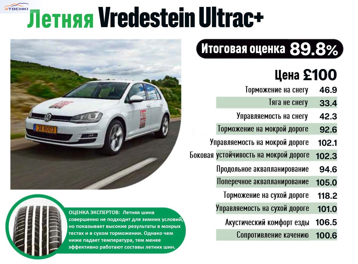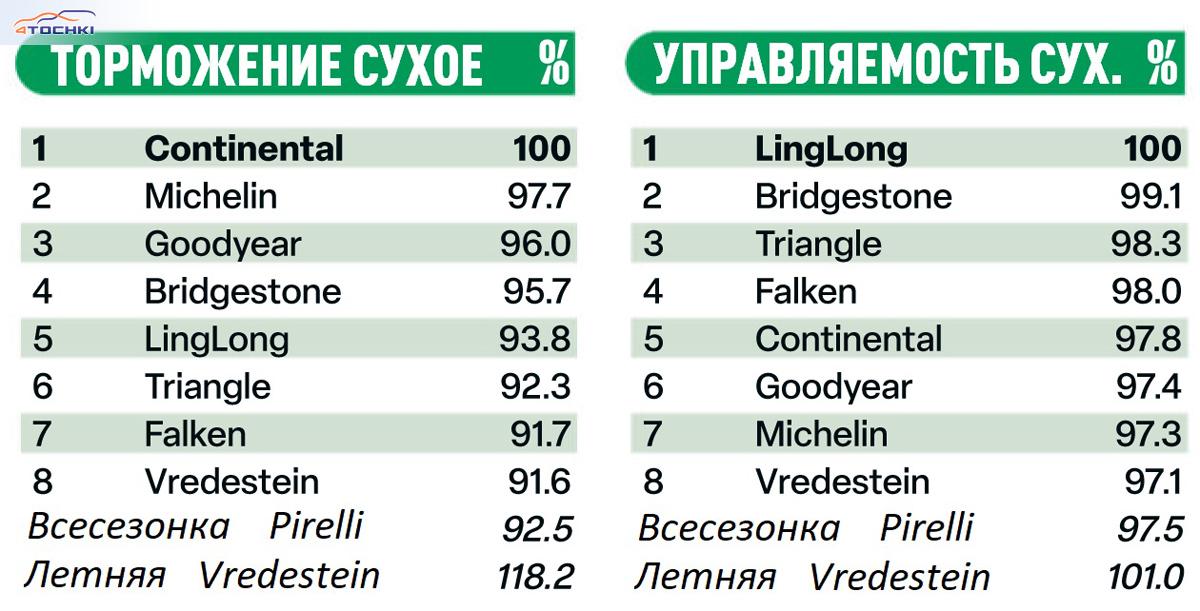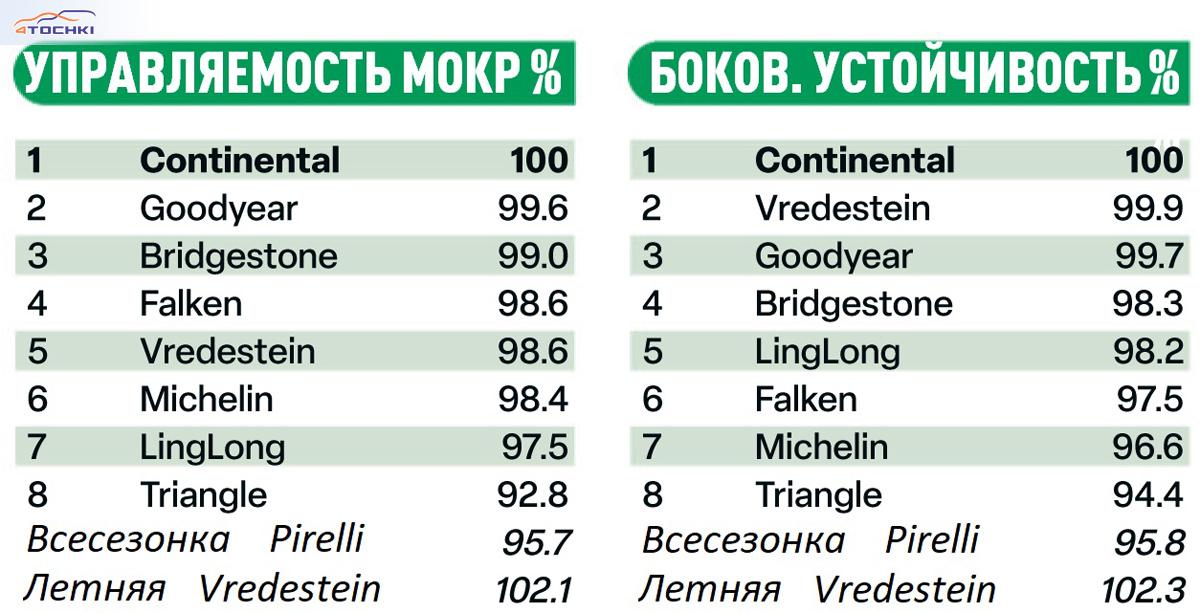 Широкие канавки летних шин действительно помогают отводить воду, поэтому летняя шина Vredestein показывает такие высокие результаты в мокрых тестах, особенно в тестах на аквапланирование; в сухом торможении и на круге летняя шина также смотрится лучше. Однако, чем больше падает температура, тем менее эффективно справляется компаунд летних шин и тем лучше работают более эластичные резиновые смеси зимних и всесезонных шин.