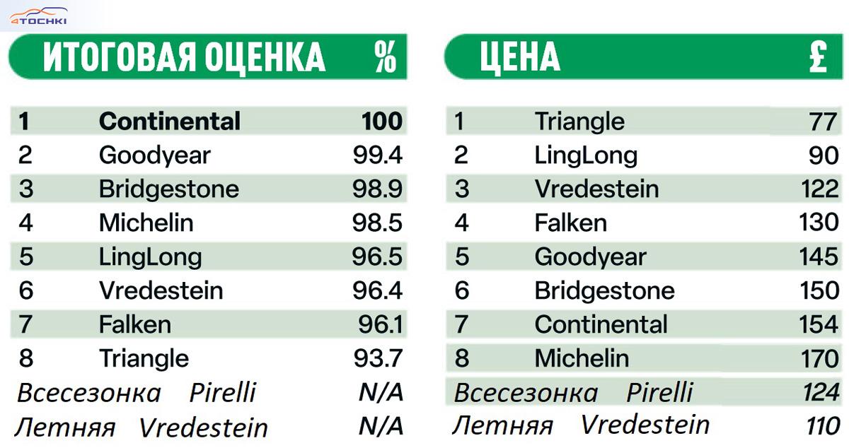 Данные о ценах были получены от онлайн-ритейлера Black Circles и актуальны для шин с установкой на момент написания отчета. Для шин, не представленных в ассортименте Black Circles, использовалась средняя цена у других ритейлеров. Цена играет лишь незначительную роль в общем результате этого сравнительного теста.