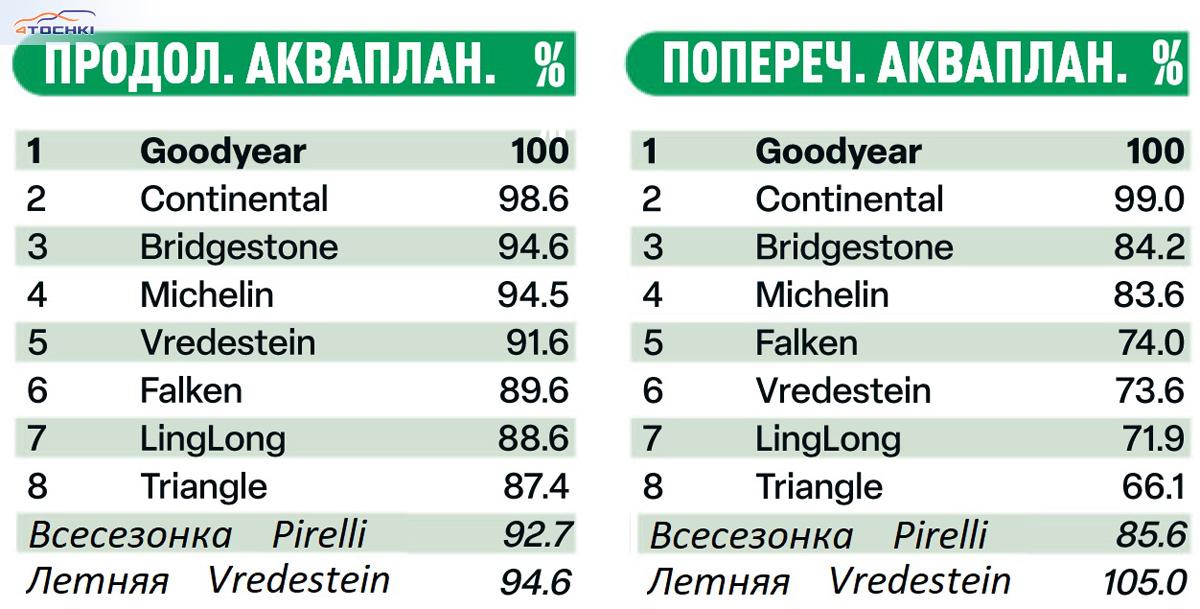 При продольном аквапланировании тестировщики измеряли скорость, при которой каждая шина, движущаяся в 9 мм воды, проскальзывала на 15 процентов по сравнению с другой шиной на сухой поверхности. При поперечном аквапланировании каждая шина проходила через кривую, затопленную водой на 5 мм, на скоростях от 37 до 56 миль/ч, и вычислялось среднее остаточное боковое ускорение.