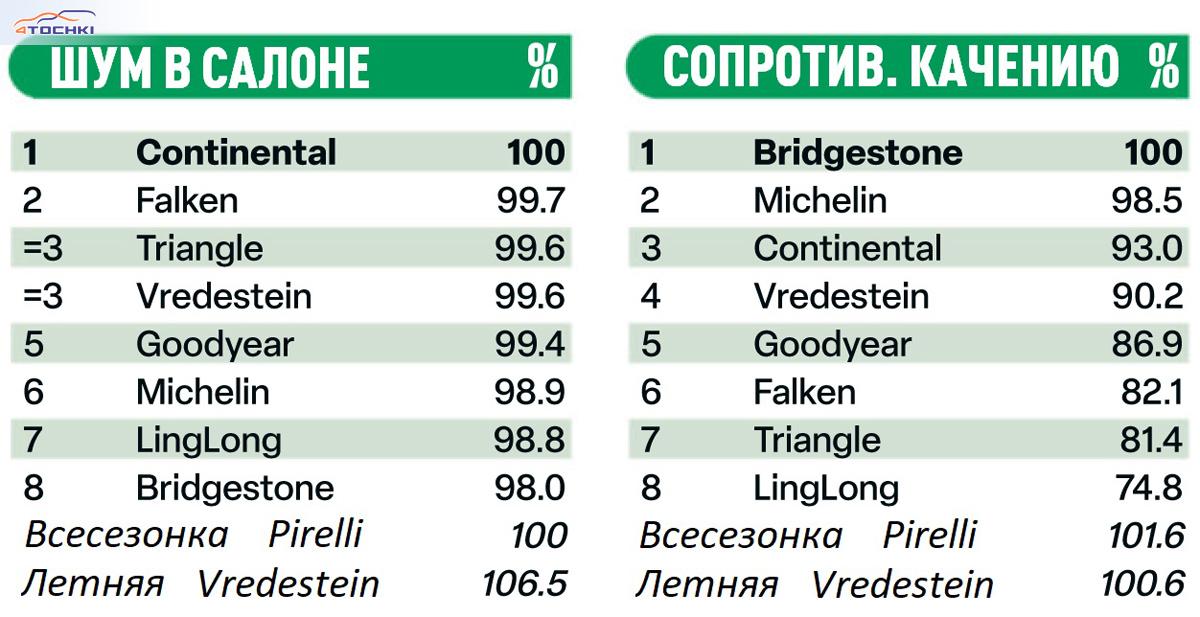 Falken (седьмое место) обладает хорошей управляемостью на мокрой и сухой дороге, а также отличается высоким акустическим комфортом езды, в то время как Vredestein (шестое место) не показала явных сильных сторон, но набрала приемлемое количество баллов в целом.
