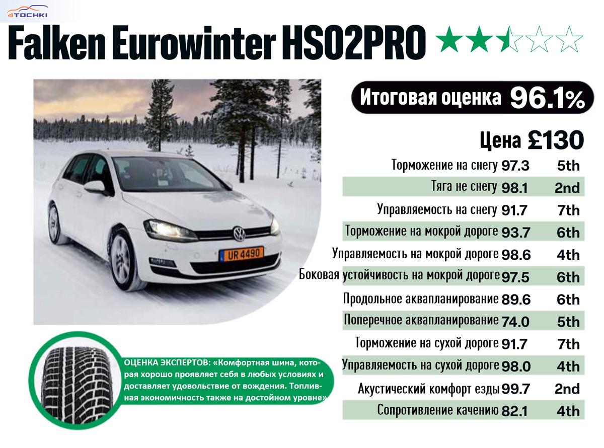 После высокого результата в сцеплении на снегу, шина Falken оказалась в середине списка в более важном тесте на торможение и заняла седьмое место на трассе управляемости, где уверенно тормозила и хорошо заходила в повороты. Ее поведение было легко предсказуемым и сбалансированным, однако ей не хватало сцепления, чтобы составить конкуренцию лидерам.