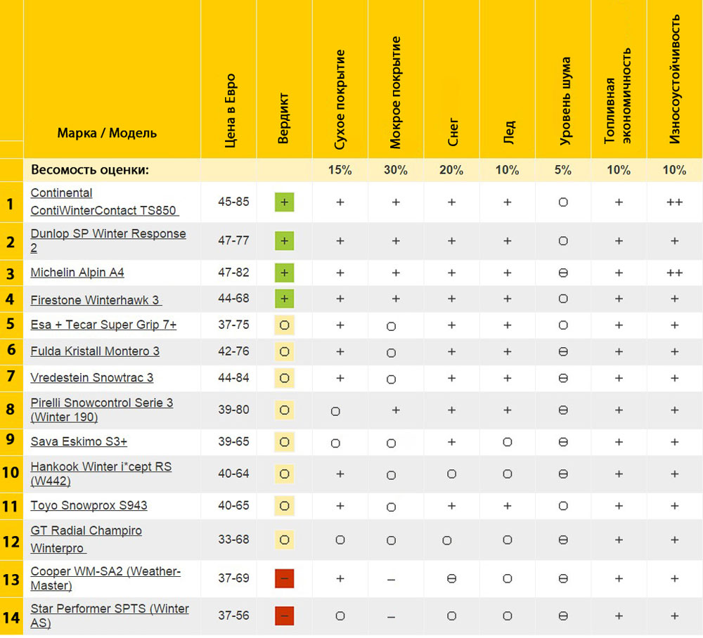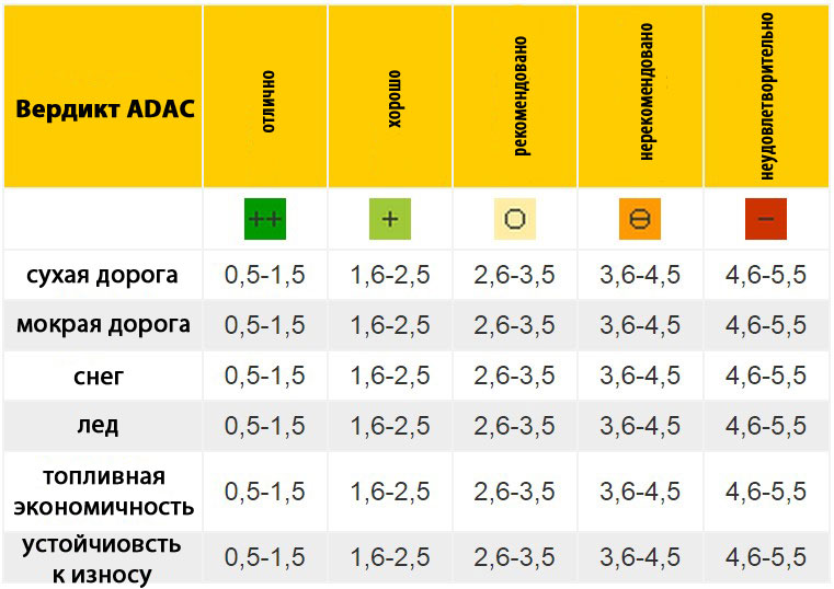 шины с хорошим балансом характеристик удостоились оценки «хорошо». Приведенная ниже таблица показывает критерии для различных дисциплин:
