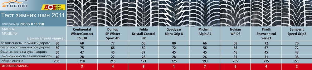 В преддверии нового зимнего сезона ACE — Автомобильный клуб Европы и GTU — Немецкое общество технического контроля провели тестирование зимних шин популярных производителей. Интерес европейских технических организаций к тестированию зимних шин вполне обоснован. Последнее время погода не очень благосклонна к Европе, мягкие теплые зимы, к которым так привыкли ее жители, остались в прошлом. Автомобилисты привыкают к занесенным снегом трассам, а производители шин продолжают экспериментируют с составами резиновой смеси и ищут новые способы улучшить качество не только летних, но и зимних моделей.