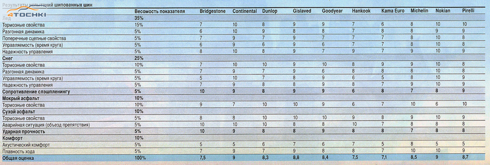 шины Continental работают немного лучше, чем 190 у шин Nokian, занявших в этом тесте второе место. Оказывается, что для снижения вредного воздействия на дорожное полотно технологи Nokian не только уменьшили вес шипов, но и сделали их меньше по высоте и диаметру. С небольшим отставанием от лидеров расположились две новинки этого сезона - шины Pirelli Ice Zero и Gislaved Nord Frost 100 с вполне приемлемыми результатами.