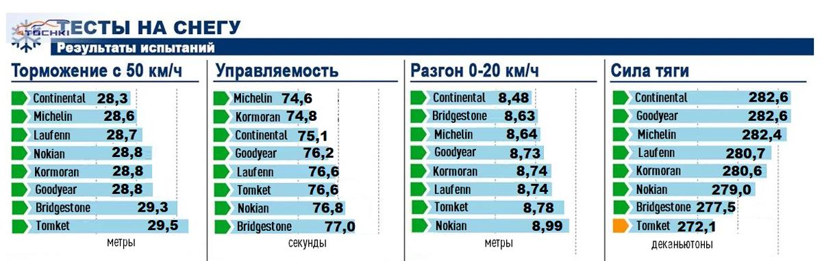 ТОРМОЖЕНИЕ. Представленные результаты показывают тормозной путь каждой шины со скорости 50 км/ч. Continental побеждает в соревнованиях на укатанном снегу. Michelin и Laufenn также показали очень хорошие результаты, в то время как Nokian Tyres, Kormoran и Goodyear немного отстают. Bridgestone и Tomket имеют немного более длинный тормозной путь, но эти шины также эффективно останавливают автомобиль. Все участницы теста прошли этот тест, гарантируя эффективное и безопасное замедление на снегу.