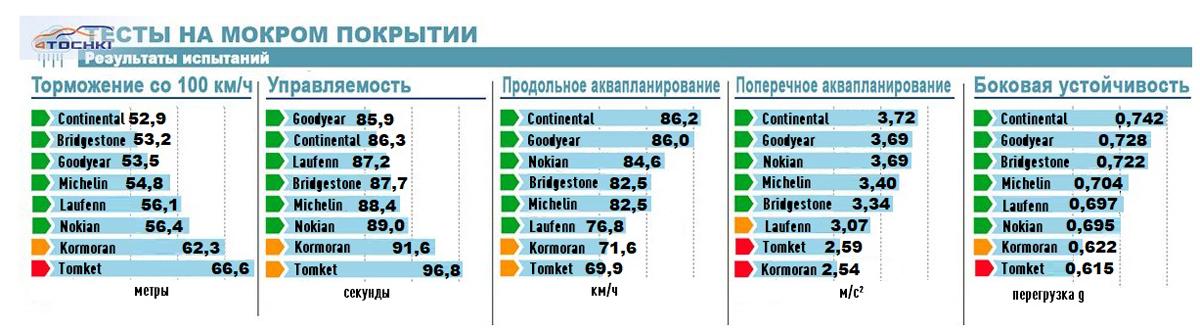 Самой быстрой на мокрой трассе показала себя Goodyear. Continental, Laufenn и Bridgestone также добились отличных результатов. Michelin и Nokian Tyres выступили хорошо, а Kormoran завершили соревнование со средним результатом. Шины Tomket показали результаты, близкие к приемлемым.