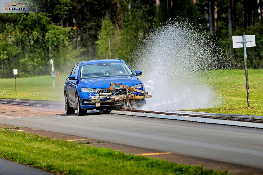ПОПЕРЕЧНОЕ АКВАПЛАНИРОВАНИЕ. Явление потери сцепления с дорогой при проезде лужи на повороте всё реже встречается на скоростных автомагистралях и шоссе, поэтому за эту дисциплину присуждаются самые низкие баллы. Этот тест определяет максимальное боковое ускорение, достигаемое каждой испытуемой шиной при прохождении испытательного трека с уровнем воды 9 мм. Диапазон скоростей - 60-90 км/ч, при этом водитель едет на 5 км/ч быстрее с каждым кругом.