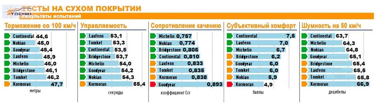 Победу одержали шины Continental, за ними следуют Goodyear и Bridgestone с очень хорошими результатами. Michelin, Laufenn и Nokian Tyres завершили тест на хорошей ноте. Kormoran показал средние результаты, а Tomket выступила ниже ожиданий.