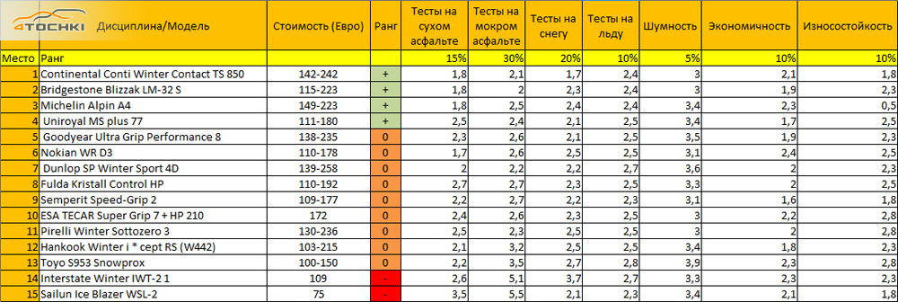 Ремарка: шины получившие отметки «удовлетворительно», «приемлемо» и «неудовлетворительно» оказывает большое влияние на финальный рейтинг. Так, шина, получившая наихудшую оценку в одной из дисциплин, не сможет занять лидирующее место в итоговой таблице.