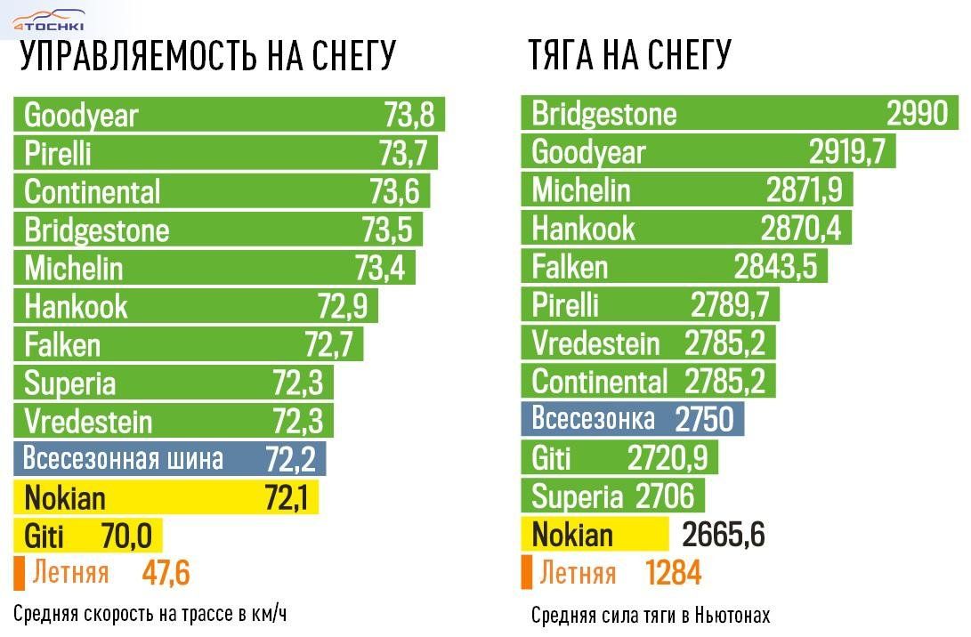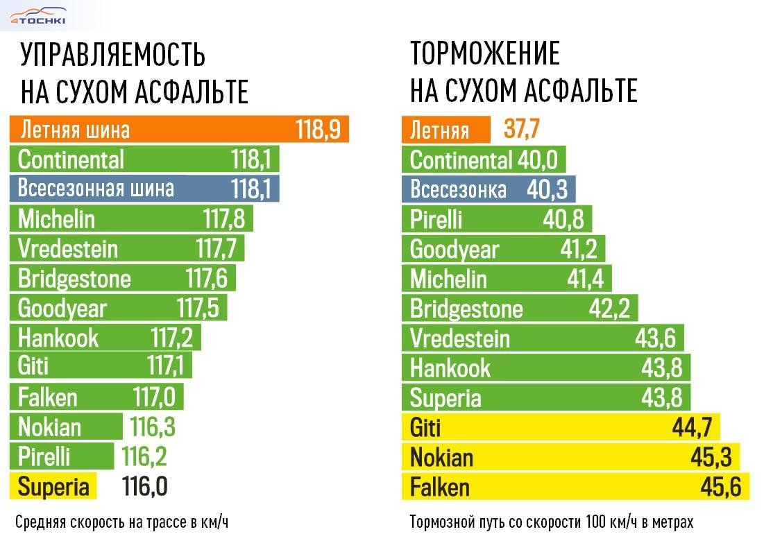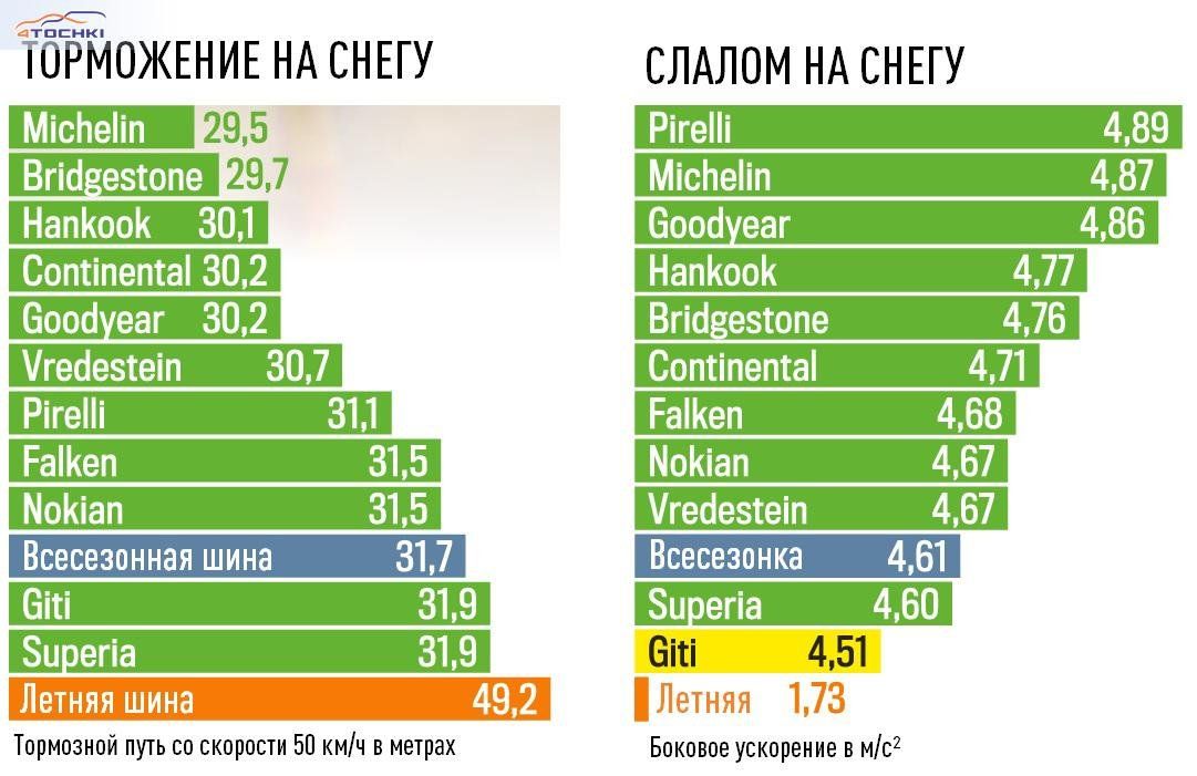ТОРМОЖЕНИЕ. Летняя шина показывает, где должна быть установлена планка. Зимняя специализированная шина от Continental и здесь превосходит всесезонную, в то время как лучшие фрикционки останавливаются менее, чем за 42 метра. Giti, Nokian и Falken требуется для остановки еще одна длина автомобиля.