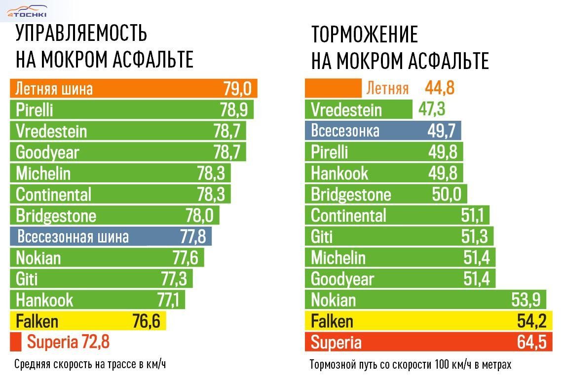 УПРАВЛЯЕМОСТЬ. Continental неожиданно показывает уровень всесезонной шины. Michelin, Vredestein, Bridgestone и Goodyear расположились следом довольно плотной группой. Pirelli, самая быстрая на мокрой дороге, теряет здесь огромное количество очков.